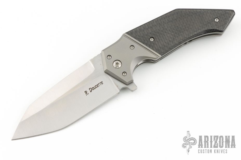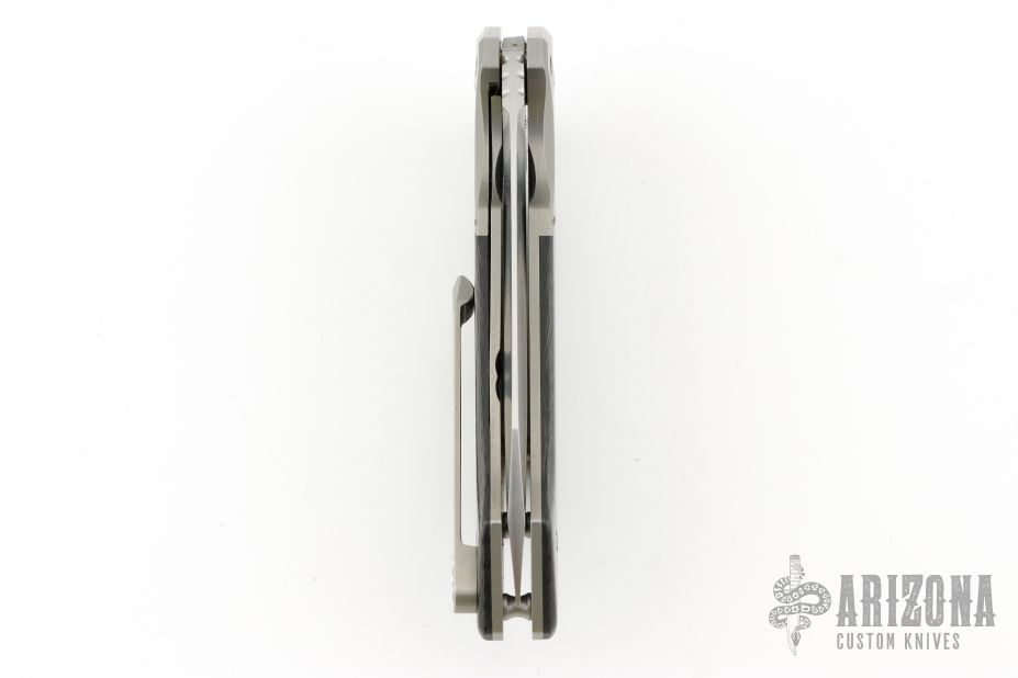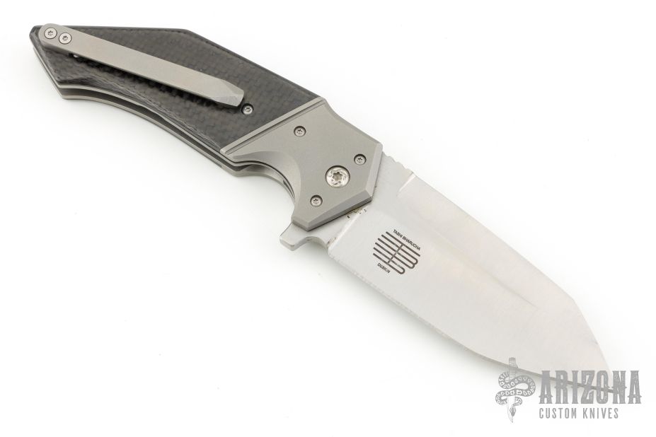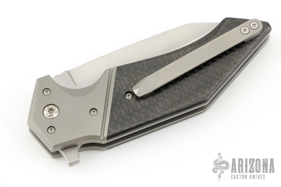 I specialize in large tactical flipper folders. I hand grind every knife blade free hand on hollow grinding wheels of various sizes. My handles are profiled shaped and contoured by hand on the belt sander. My custom pocket clips are hand ground from thick titanium which I designed to ride low in your pocket because I wanted my knives to have a secure fit when being carried. When I design my knives I use straight lines with a futuristic look using high tech materials such as: Lightning strike carbon fiber, titanium, G10 and powdered steels.