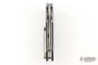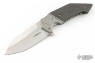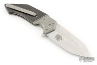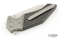 This Jack Flipper by Randy Doucette and Tashi Bharucha has a satin finished tanto/clip point blade with swedge and fileworked thumbrest and flipper tab. The handle has a bead blasted titanium frame, carbon fiber covers, with a matching tip up clip and stand-offs. Flips great, nice detent, lockup and blade seating. Excellent condition.