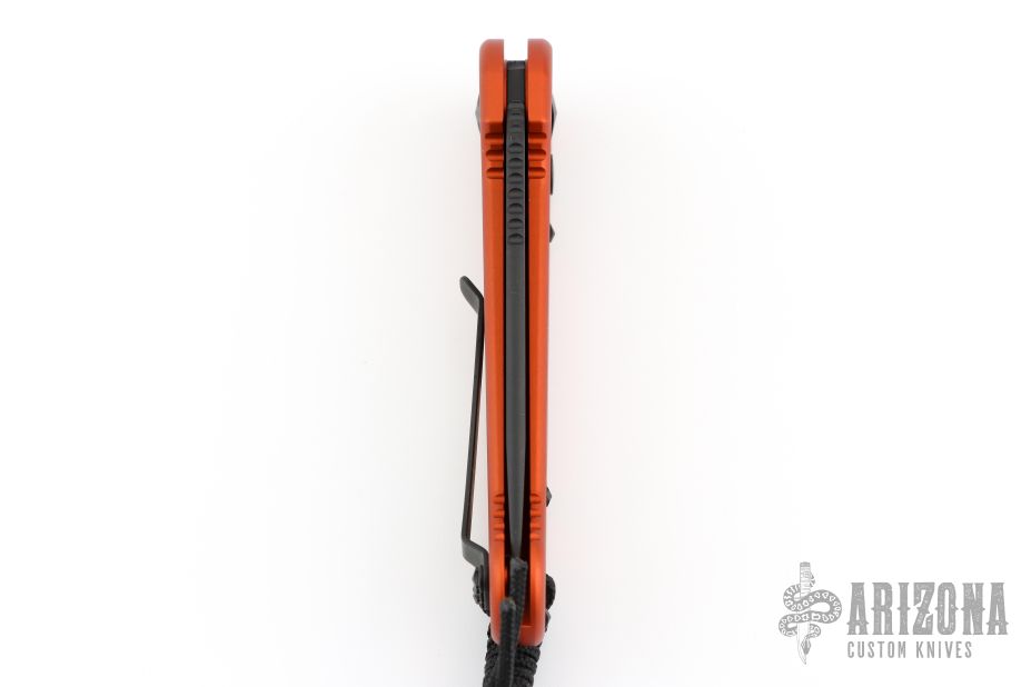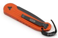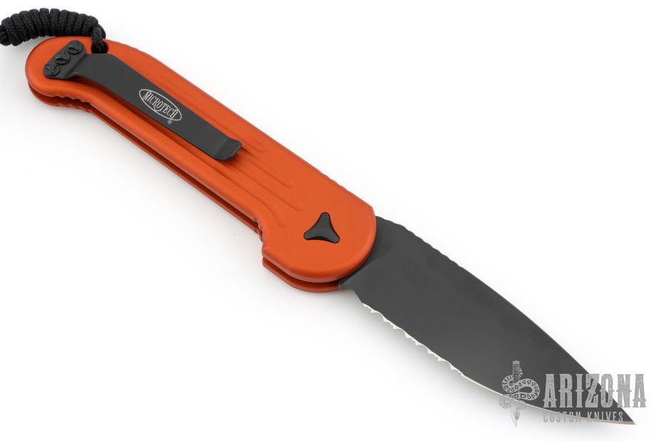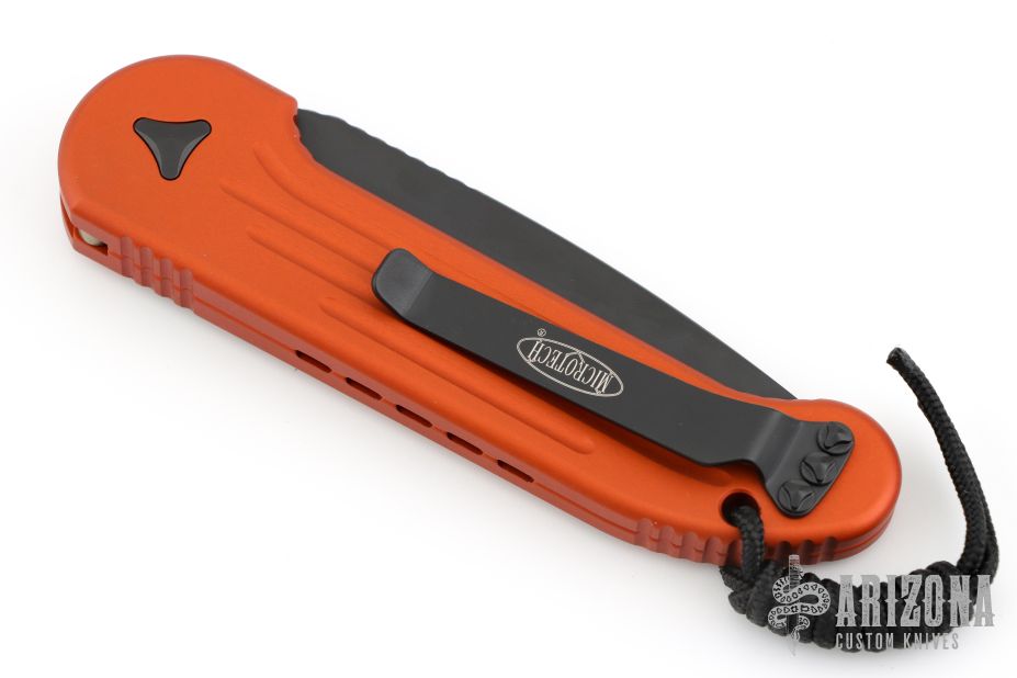 This LUDT side opening automatic from Microtech has a black finish blade with a partially serrated edge and a contoured orange aluminum frame. Stainless steel clip. Dated 04/2021 and serial number 23619, comes with original box and papers. Excellent condition.