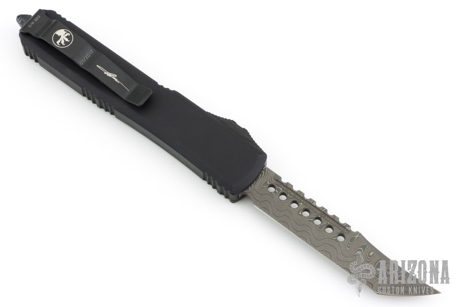 This Ultratech Hellhound Tanto by Microtech features a Damascus blade, notched thumbrest and a nearly sharpened top edge. The handle is black aluminum with ringed titanium hardware, black stainless steel clip, has a carbon fiber top. Comes with original box and papers. S/N 003 and dated 01/2017. From the Marfione House Collection.