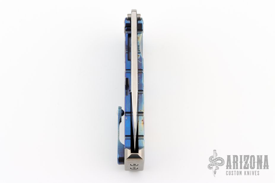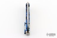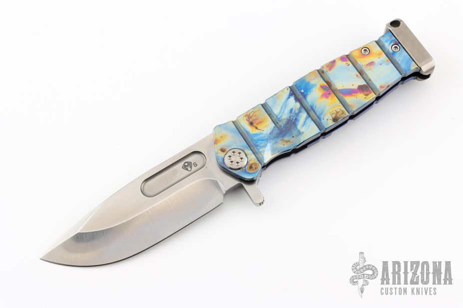 We believe we’ve come up with the best folding companion to the classic Marine Utility knife on the planet. The knife is a perfect companion piece to the fixed “Fighter” and we call it the, “The Fighter Flipper.” This is a unique mix of Titanium components with the very best blade of S35VN heat treated to HRC 58. This a big manly knife that’s as comfortable working, as it is cruising around town in your pocket. There is so much going on with this knife its hard to take in: from the retro milling on the handles, drop-point blade, integral pommel to the bearing pressed into the one-of-a-kind pocket clip. There truly is NOTHING like the Fighter Flipper™ in the knife world. You will want to chop, stab and smash something with this beast in your hand so proceed with caution… Comes with original box, papers, and clasped case. Excellent Condition.