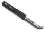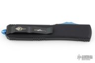 This Ultratech Hellhound Tanto by Microtech features a two-tone blade with satin finished flats, notched thumbrest and a nearly sharpened top edge. The handle is black aluminum and carbon fiber with anodized titanium hardware and a DLC stainless steel clip. Comes with original box and papers. Excellent condition. Dated 05/2017. Clip has the Anthony/Sean Marfione dagger logo.