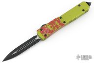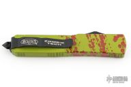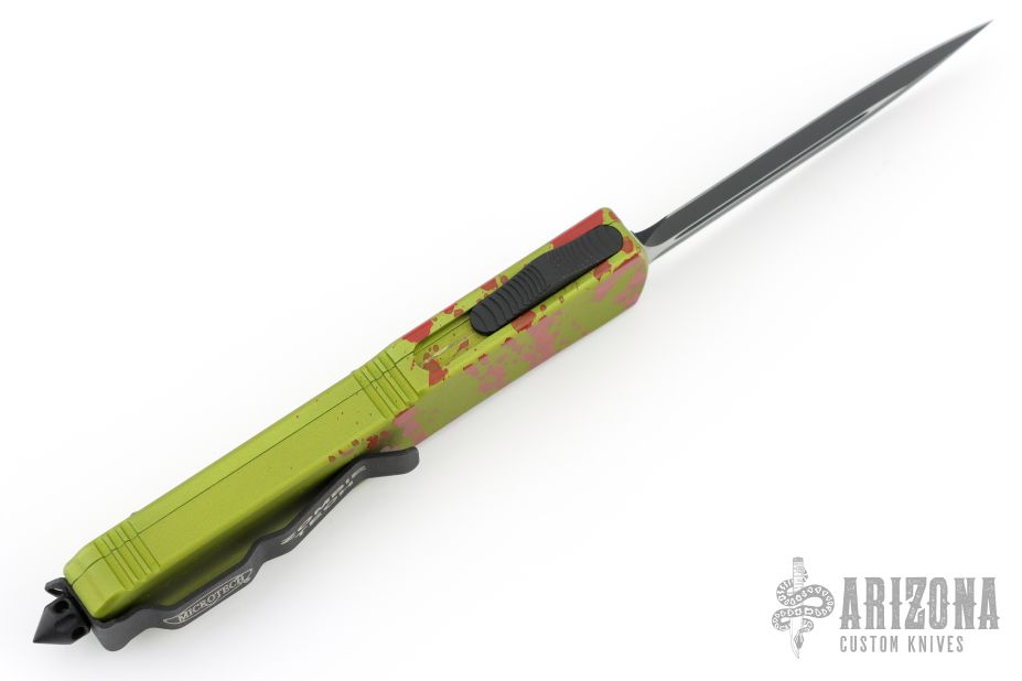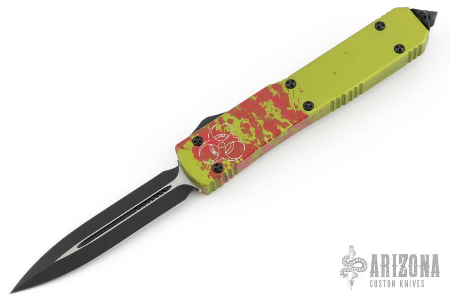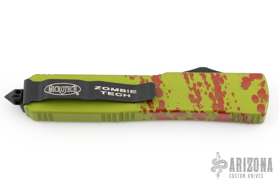 This Ultratech ZombieTech OTF Auto has a black double edged blade with fullers. Handle is toxic green anodized aluminum with custom random blood spatter pattern, and a black stainless steel tip up clip with integral glass breaker. Excellent condition. Comes with original box. #003 dated 2012. From the Marfione House collection.