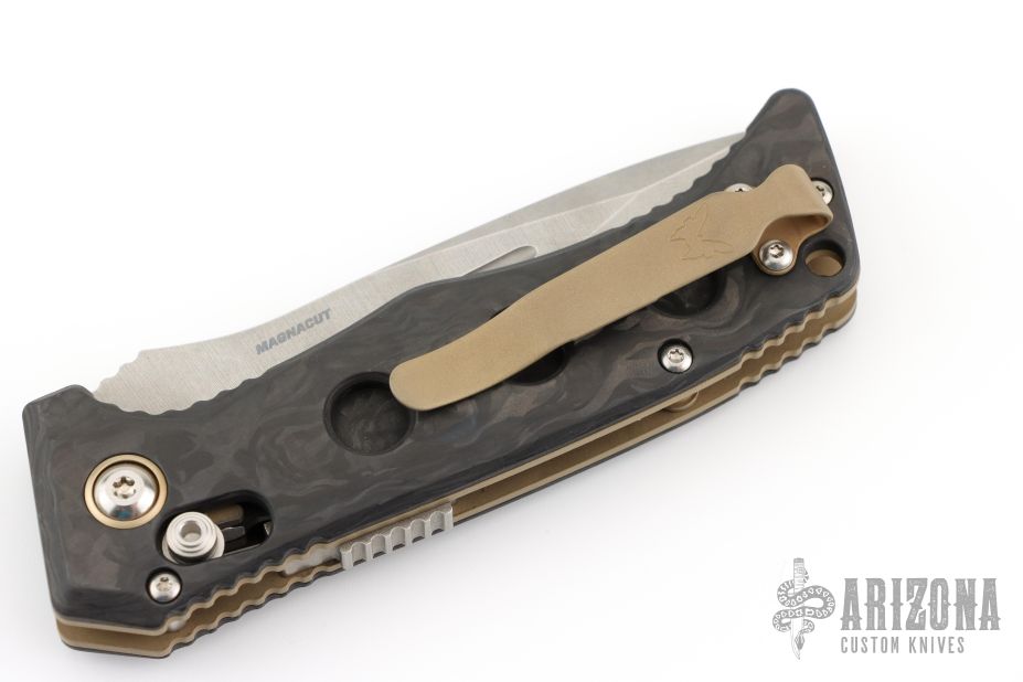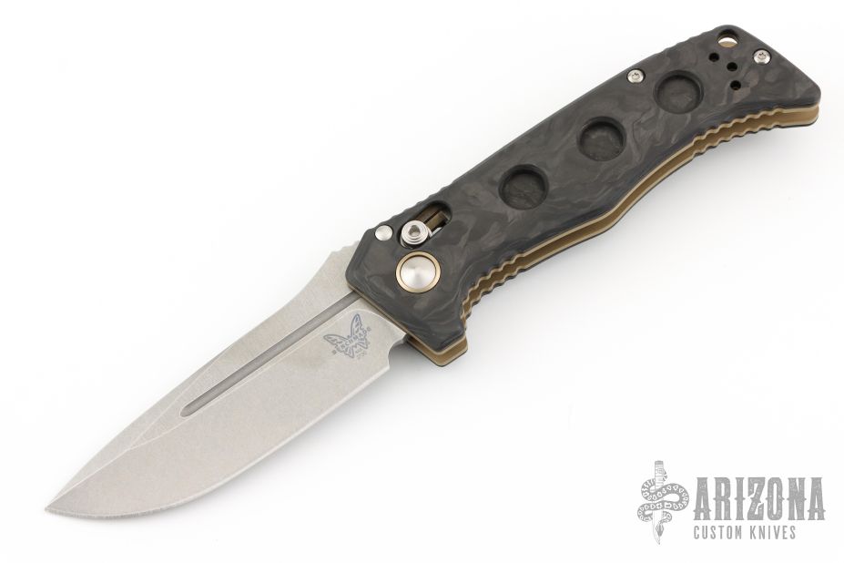 The automatic Mini Adamas, designed by Shane Sibert, is a stand-out Benchmade pocket knife built for EDC and tactical use. It features Benchmade's AXIS Auto mechanism, which automatically opens the blade by simply pulling the AXIS Lock crossbar as you would when closing the knife. It has a contoured, jimped handle that provides plenty of comfort and grip and a deep-carry pocket clip for secure pocket carry. Take on anything with this compact powerhouse automatic knife!