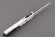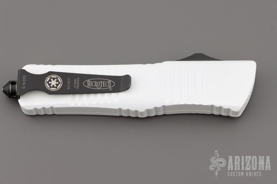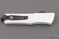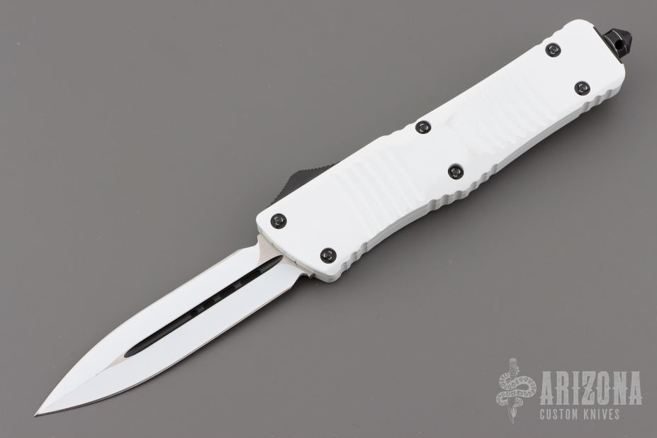 This Combat Troodon OTF automatic by Microtech knives features a white double edged blade, and a white aluminum handle with black hardware, tip down carry. Glass breaker. S/N 055. Dated 02/2017. Has some minor wear on the finish, otherwise excellent condition.