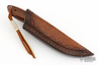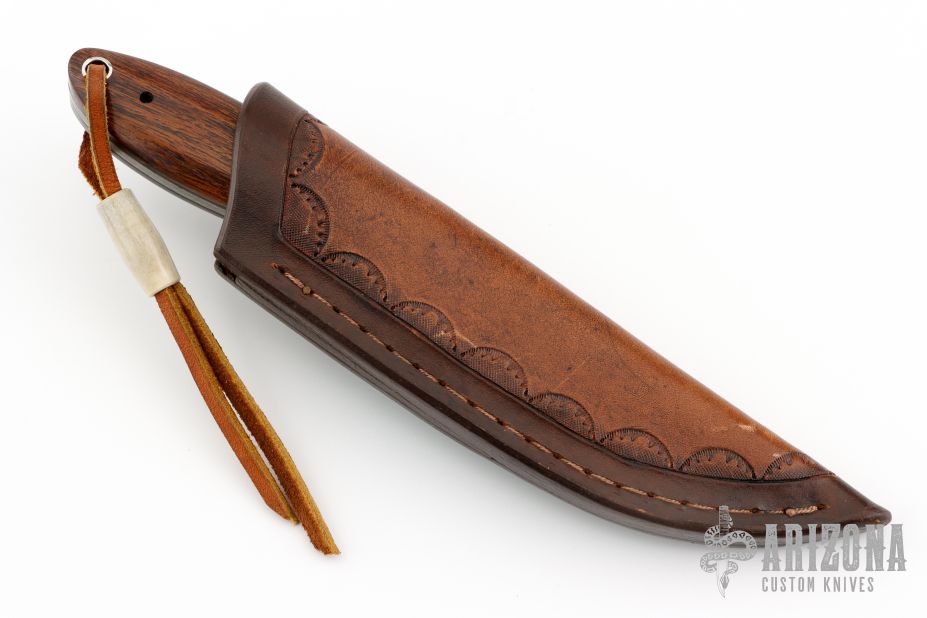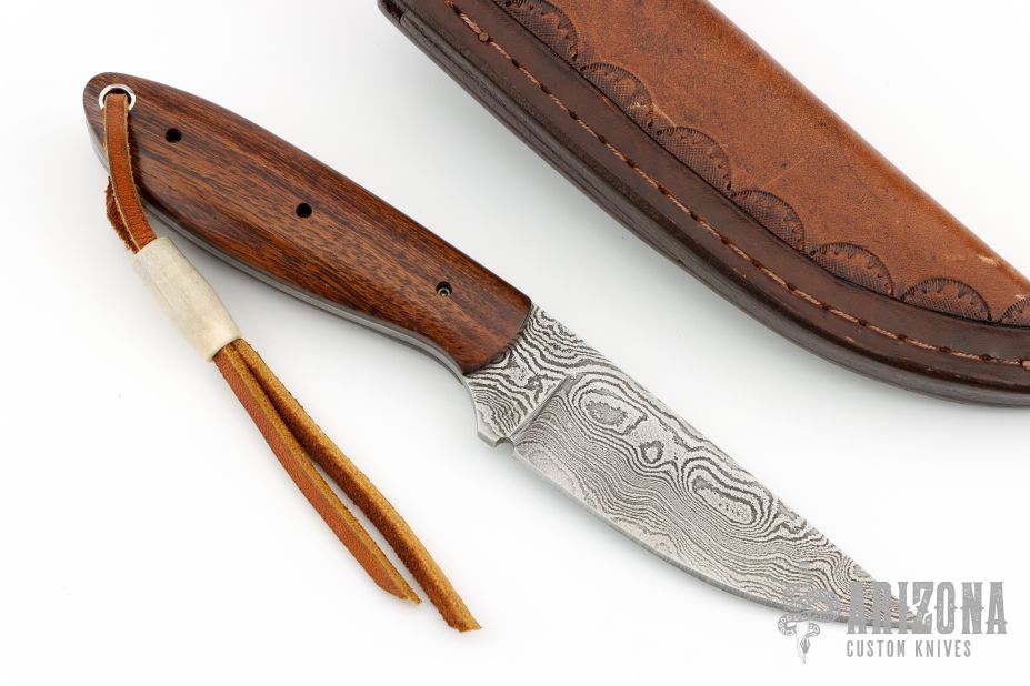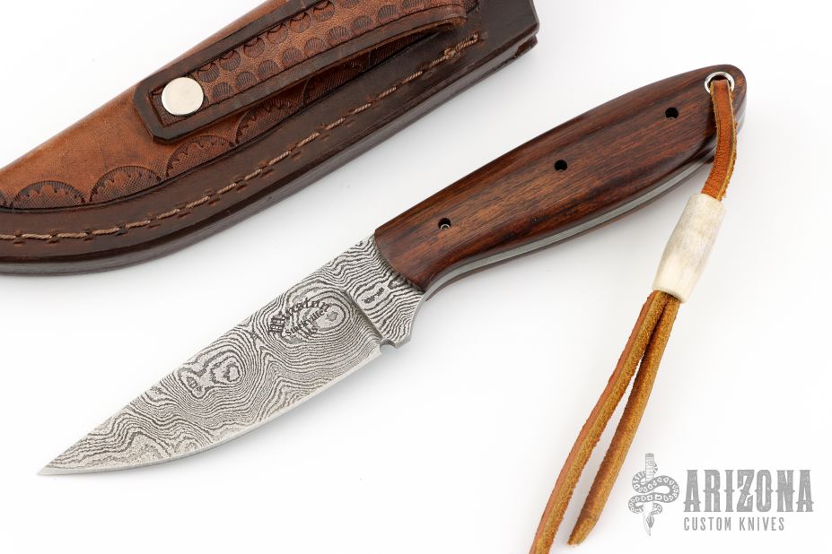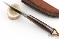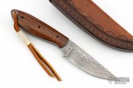 This fixed blade from David Winston features a Damascus blade with .121" blade stock and .990" blade depth, full tang construction. The handle has wood scales over black liners. Comes with a hand tooled brown leather sheath. Excellent condition.