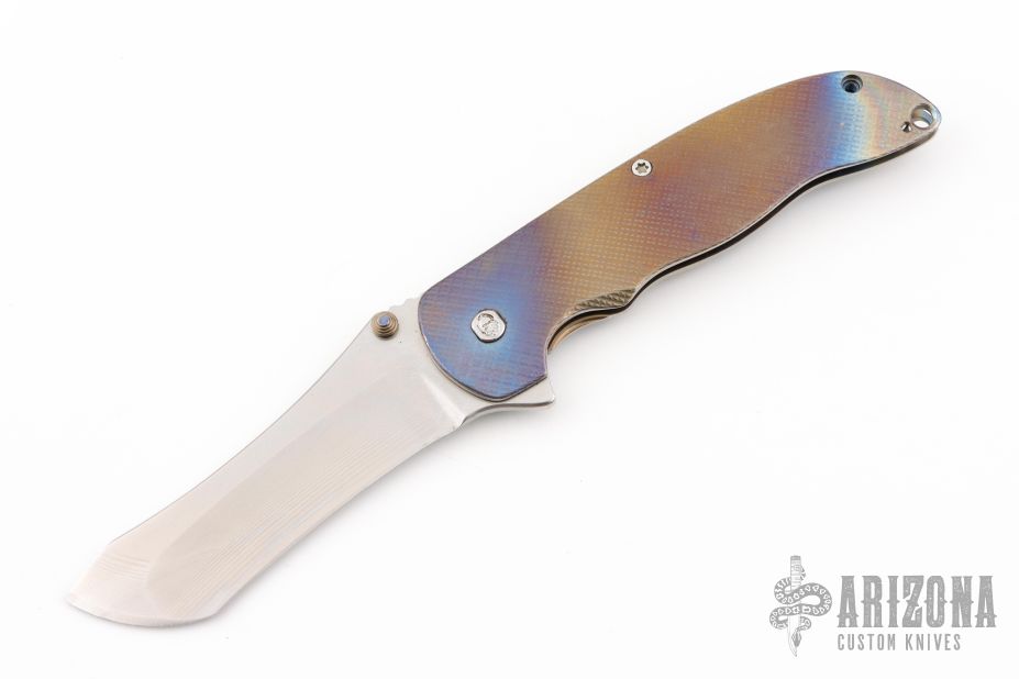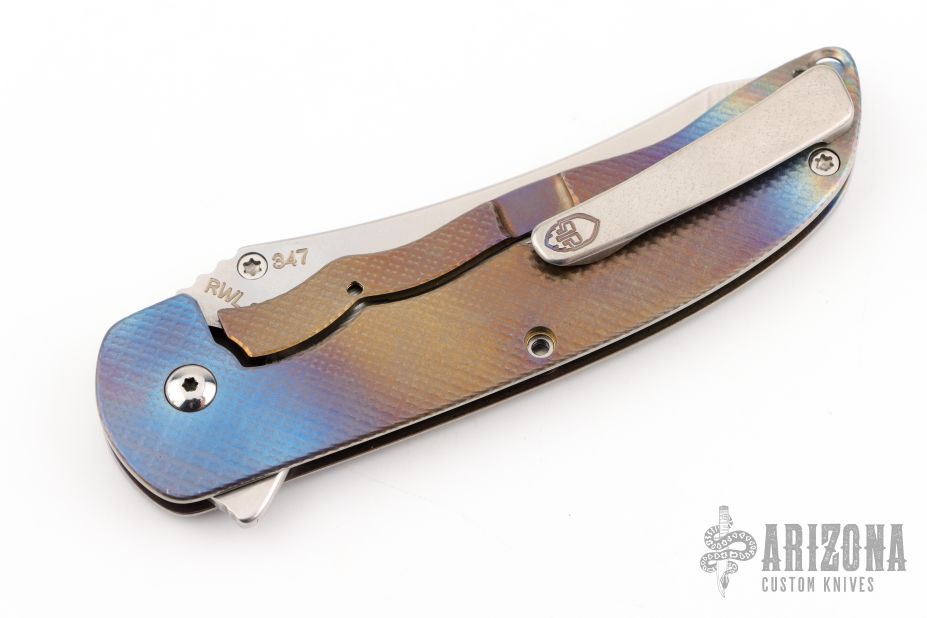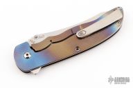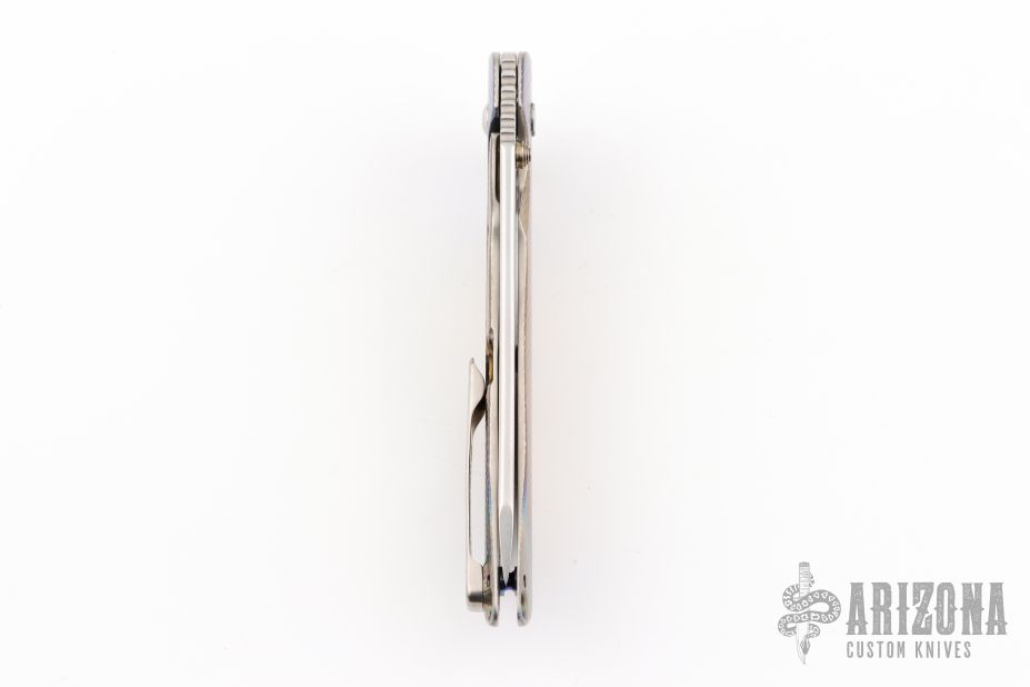 This Norseman (#347) by John Grimsmo features a tumbled blade with a single anodized titanium thumb stud, notched thumb ramp and flipper. Stonewashed and anodized titanium frame with a milled pattern front scale and titanium screws. Titanium tip up pocket clip with hidden screws. Very smooth action that requires no wrist movement. Nice detent, lockup and blade seating. Rides on bearings. The knife is missing a screw in the frame and the overtravel stop.