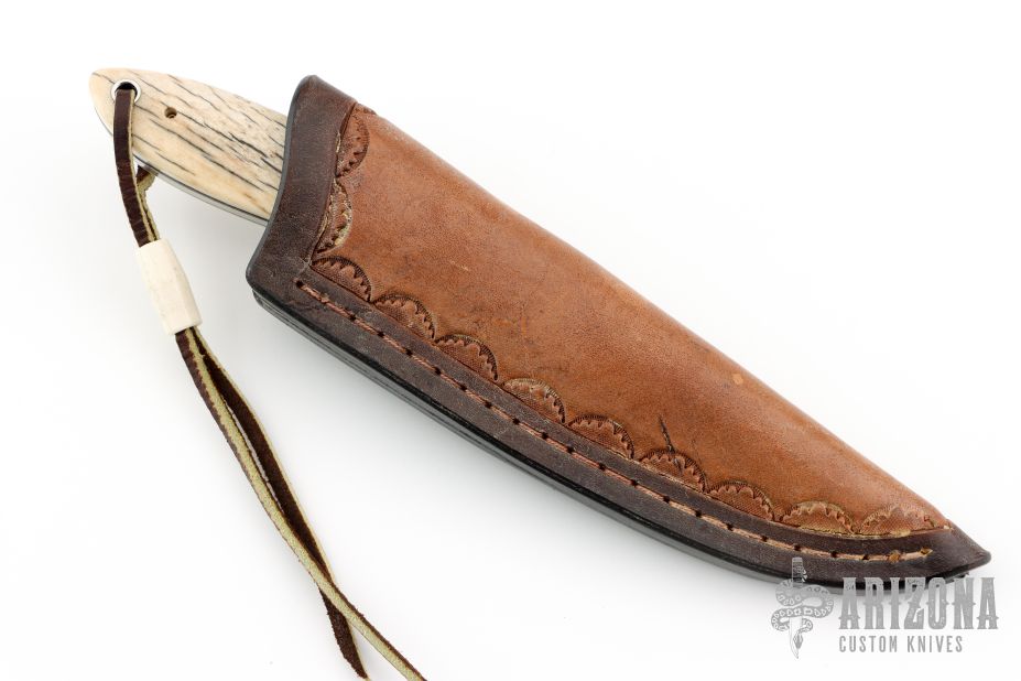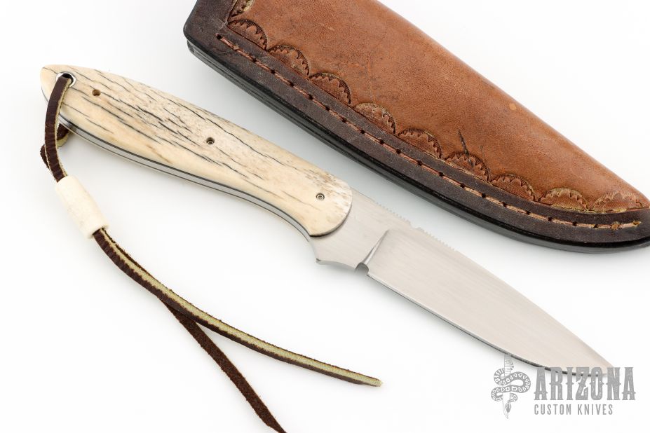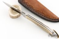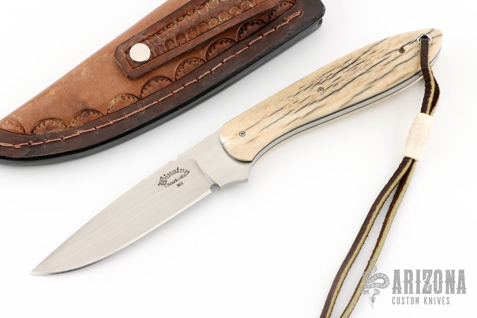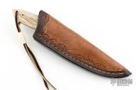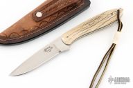 This Hunter from David Winston features a hand rub satin finished blade with .139" blade stock and .905" blade depth, full tang construction. The handle has mammoth scales over black liners. Comes with a hand tooled brown leather sheath. Excellent condition.