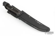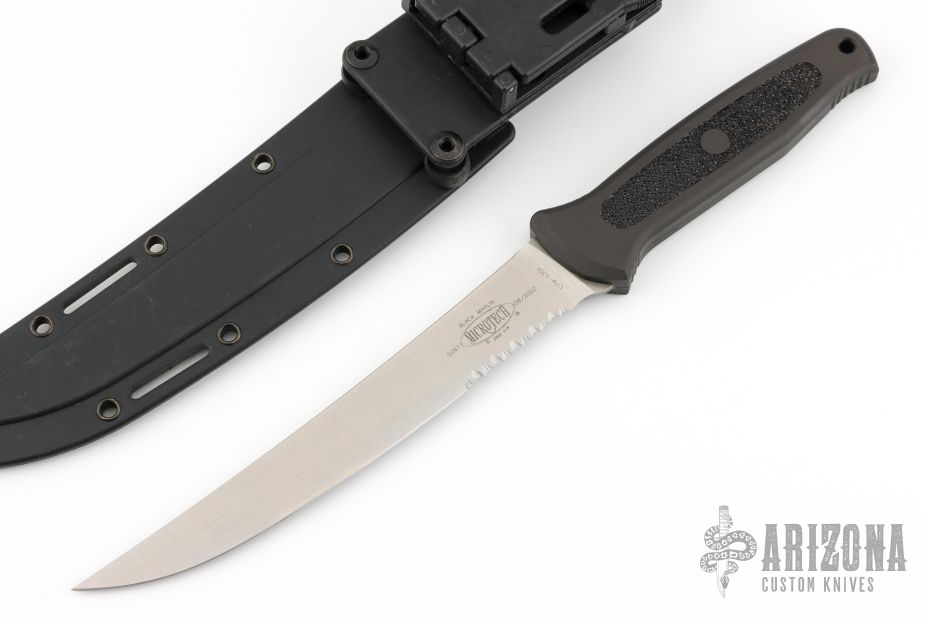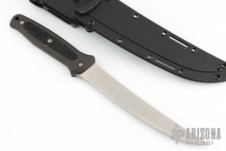 This Black Marlin Fillet Knife by Microtech Knives features a tumble finished, partially serrated upswept blade with 0.126" blade stock and 1.008" blade depth. The handle is comprised of black anodized aluminum with rayskin inserts over hidden tang construction. Lanyard hole in pommel. Comes in the wrong Black Marlin Microtech box and original papers. Includes injection molded sheath with Tek-Lok. Some minor sheath marks on blade but otherwise excellent condition.