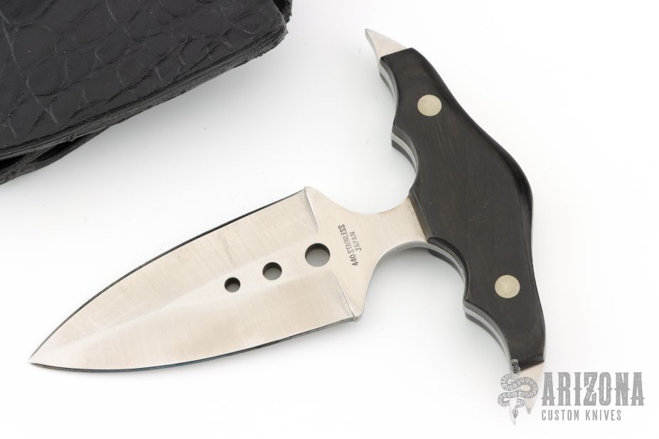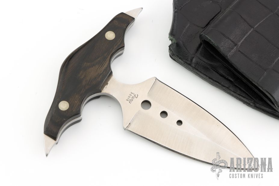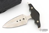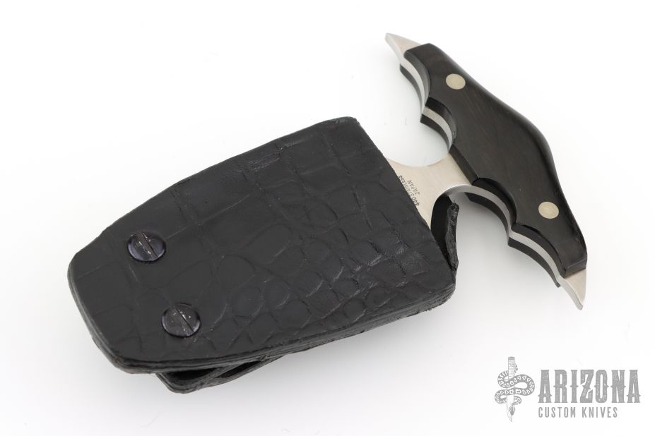 This Push Dagger by Fury features a satin finished double edged blade, .153" blade stock and 1.495" blade depth, full tang construction. The handle has dymondwood scales. Comes with a custom black leather covered kydex sheath. Has a couple light scratches, otherwise excellent condition. #33018.