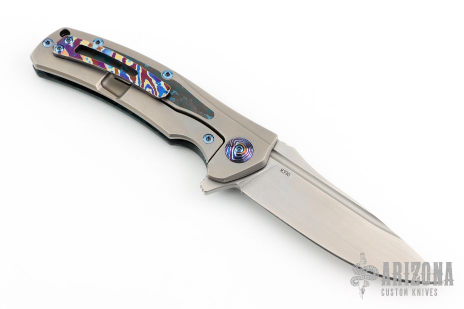 This Horizon D by Reate Knives features a hand satin M390 blade, Fat Carbon show scale and lock side inlay, as well as Chad Nichols MokuTi pivot collars!  Nice detent, lock up and blade seating.  Includes the original box, extra hardware, and pouch. Excellent Condition.