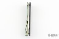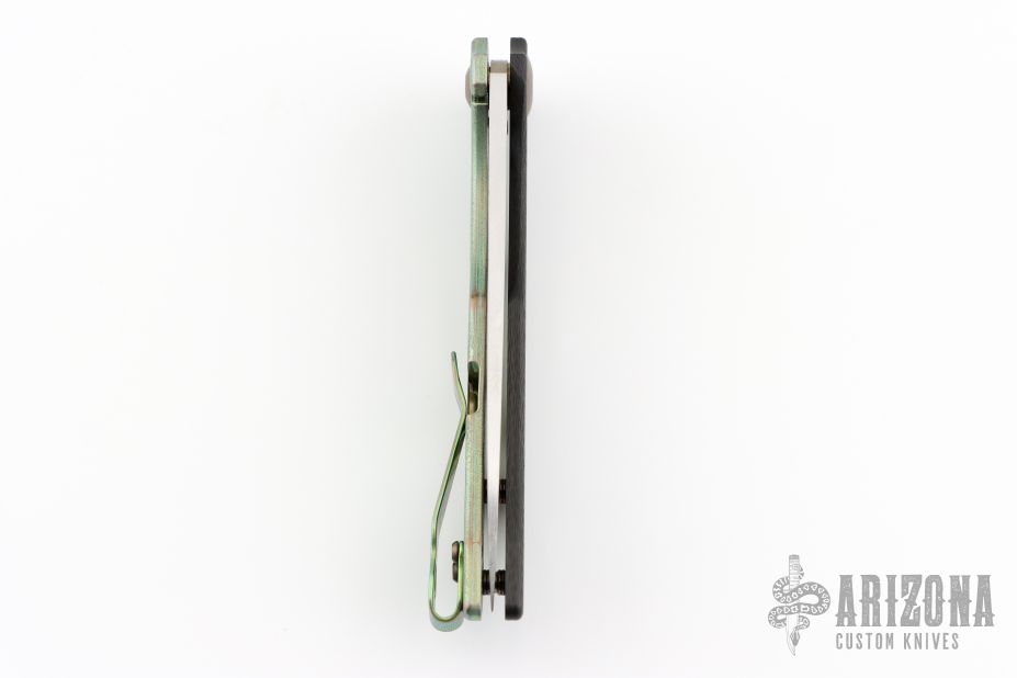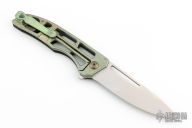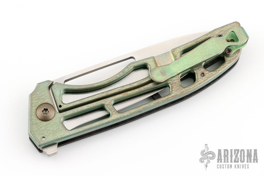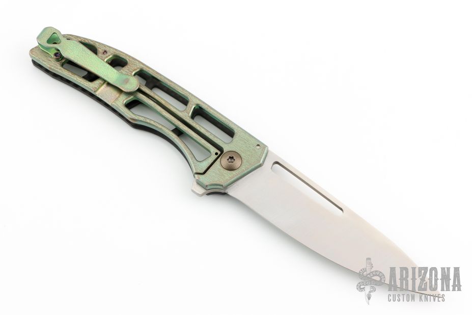 This Slitter from John Gray Knives features a satin finished drop point blade with a flipper. The handle has a ported carbon fiber and anodized bark finished titanium frame with orange peel tip up clip. Nice detent, lockup and blade seating. Comes with a zippered case and COA. Excellent condition.