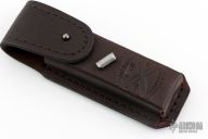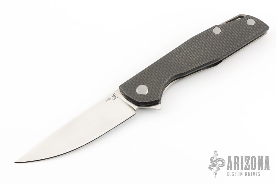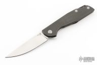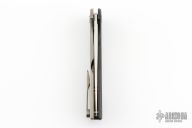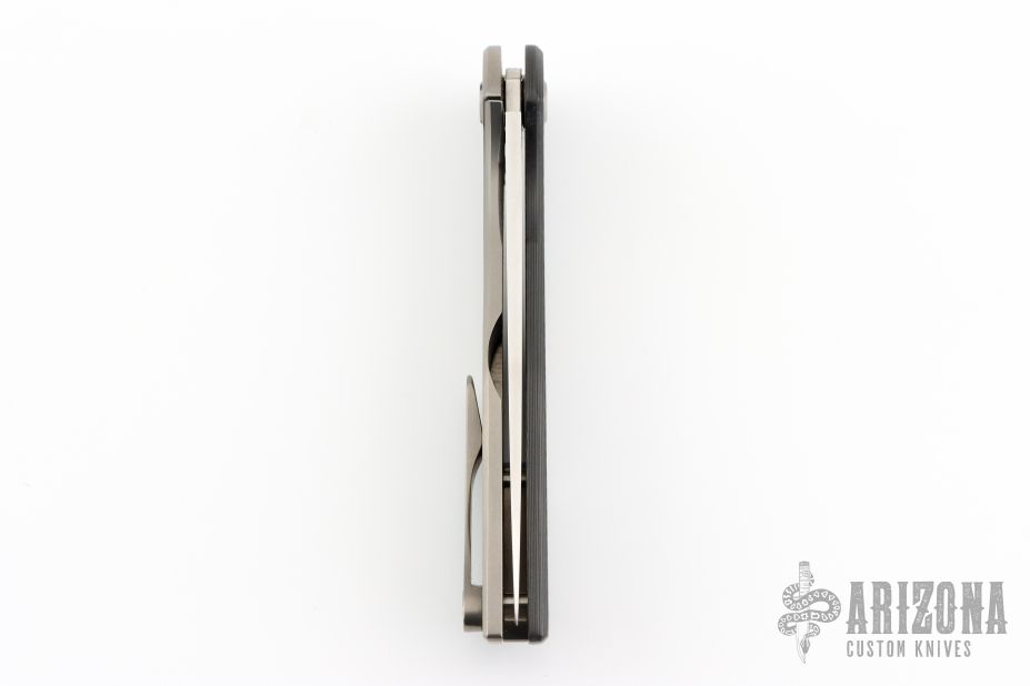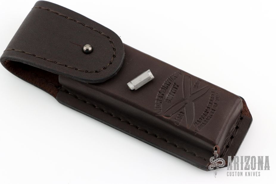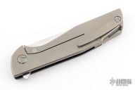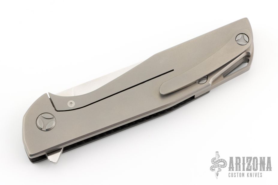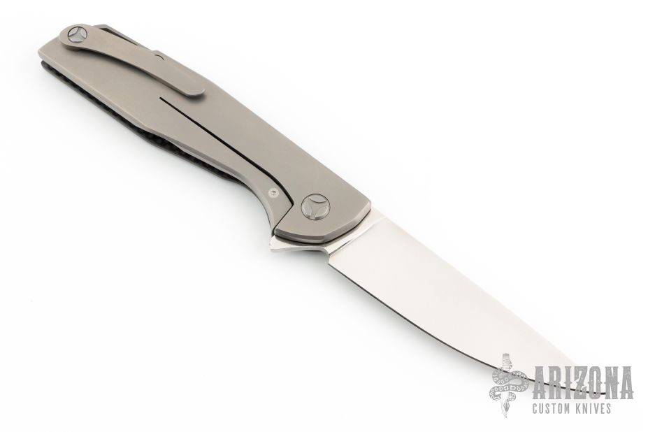 This Sigma-1 flipper by Andrey Biryukov features a "frost" style polished blade, with notched flipper tab. The handle has a bead blast finished titanium frame with carbon fiber cover, tip up clip, and backspacer with lanyard bail. Comes with original leather belt sheath, COA (in russian) and pivot tool. Excellent condition.