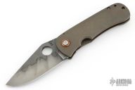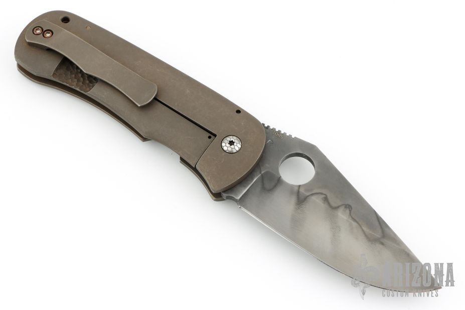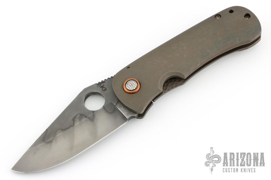 This knife features a hollow ground blade with hamon line and thumbhole. The handle has a tumble-finished titanium frame, copper pivot collar/backspacer and a titanium tip up clip. Nice detent and lockup. Comes with COA, Dated 2019. Excellent condition.