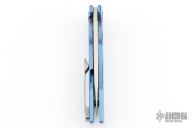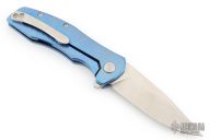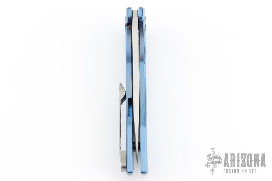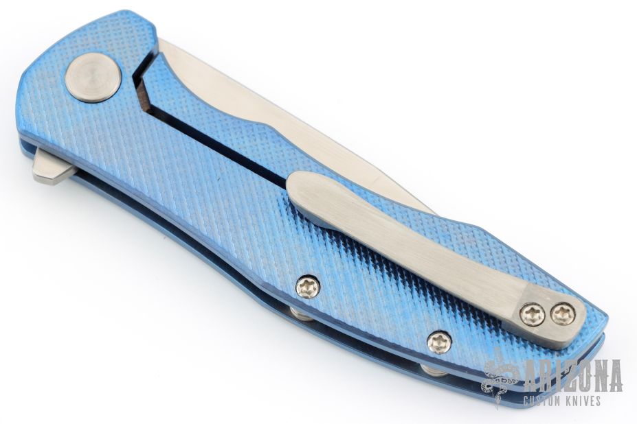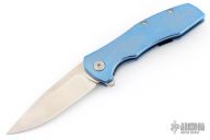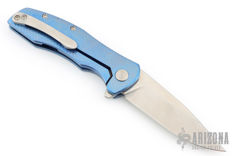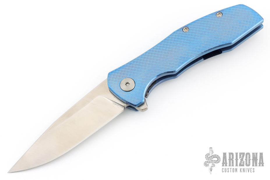 This Mini Workman by Spencer Cox features a satin finished drop point blade.  The handle has a milled/anodized titanium frame with a titanium tip up pocket clip.  Includes a brown leather sheath and COA. S/N 14.  Has a few light scratches, otherwise the knife is in excellent condition.