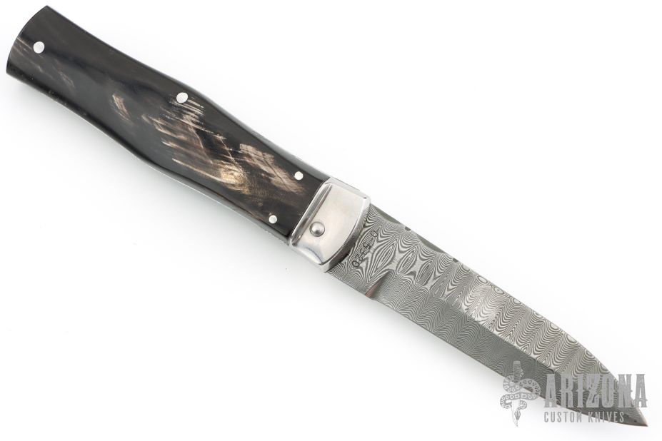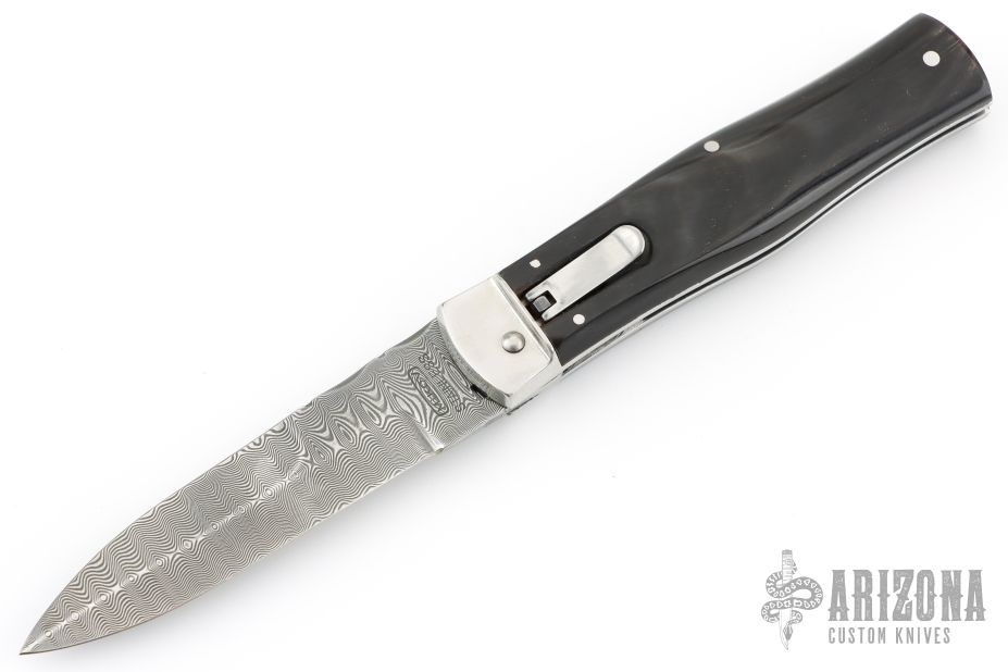 This lever auto from Mikov Knives has a Damascus spear point blade with false top edge and fileworked blade spine. The handle has polished stainless steel bolsters and liners, and buffalo horn scales, fileworked stainless steel backspacer. Excellent Condition. Comes with a cloth pouch.