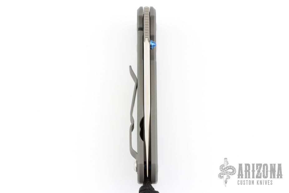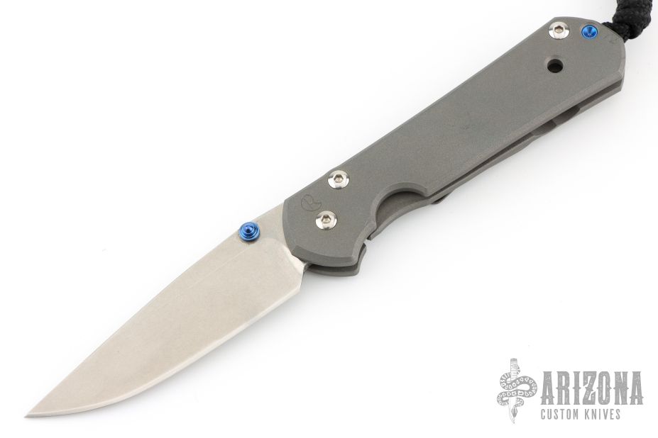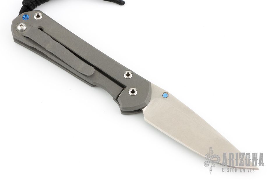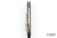 This Small Sebenza 21 by Chris Reeve features a tumbled blade with single anodized thumbstud. The frame is bead blasted titanium with matching tip up clip. Nice detent, lockup and blade seating. Excellent/new condition. Comes with original box and COA dated April 14, 2010.
