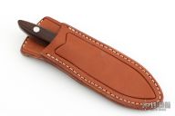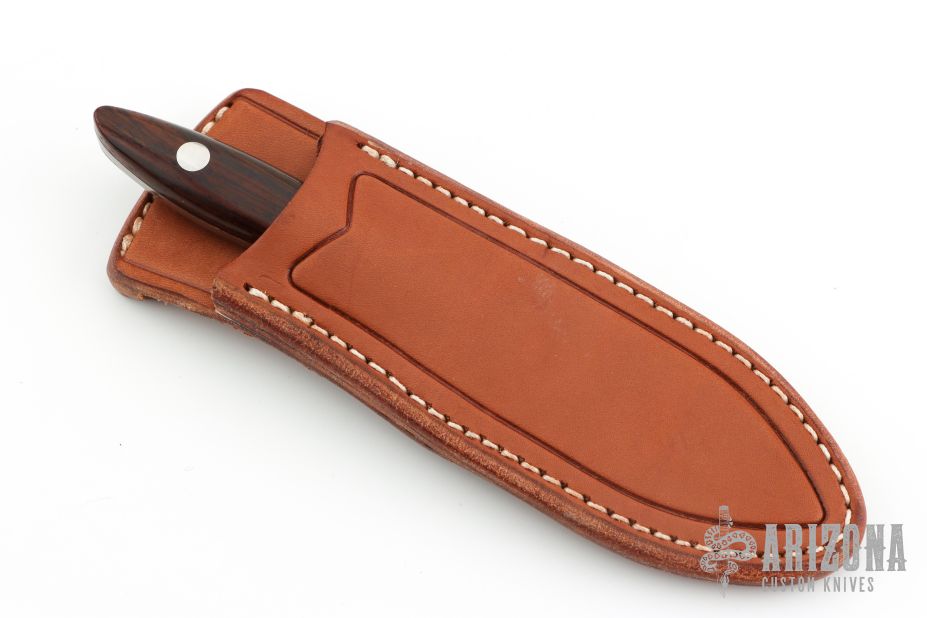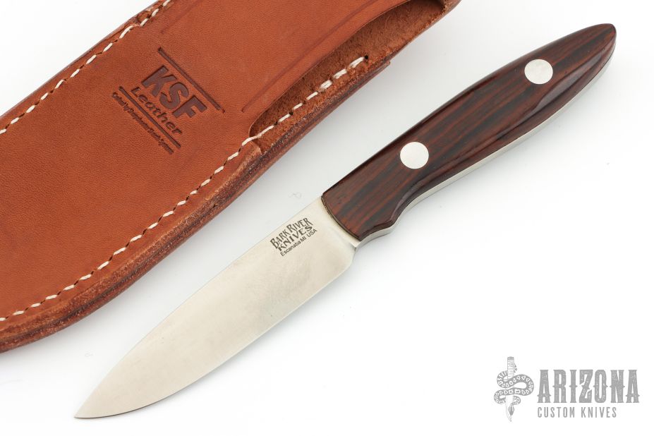 This fixed blade from Bark River Knives features a satin finish drop point blade with .157" blade stock and .851" blade depth. The handle has pinned wood slabs, over full tang construction. Comes with leather belt sheath. Has some scuffs and marks on the blade. The scales have shrunk slightly, Excellent condition otherwise.
