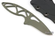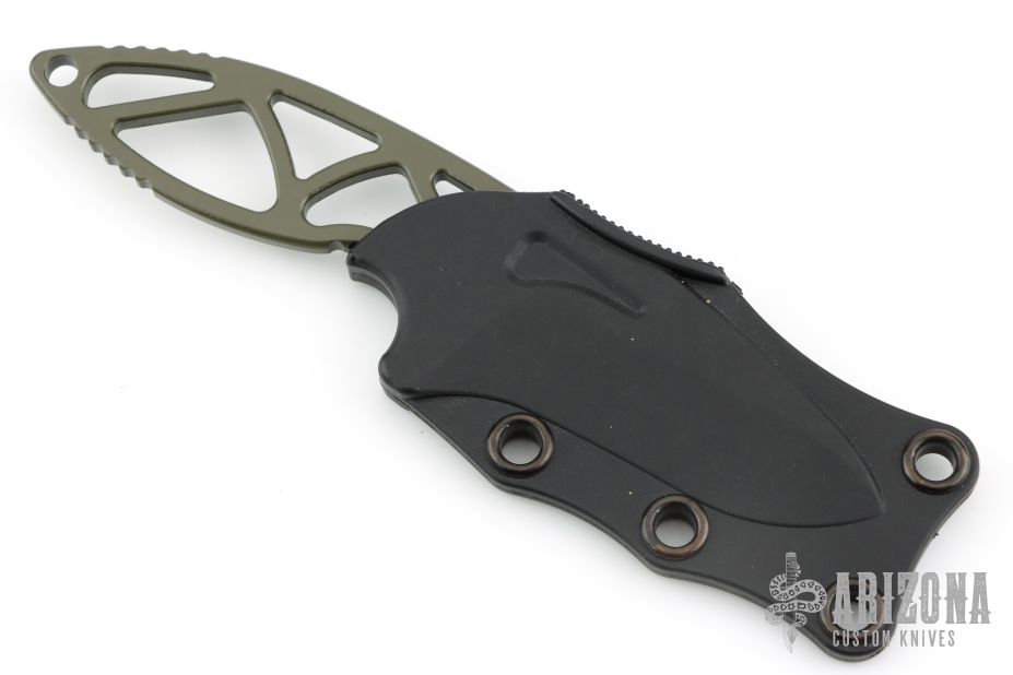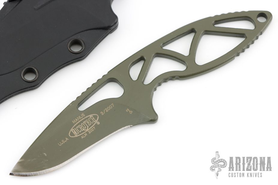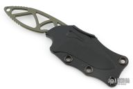 This Manus Neck Knife has a green 154-CM stainless steel drop point blade with notched thumbrest. Frame is skeletonized 154-CM with milled contours and lanyard hole. Comes with original sheath. Has some scuffs and wear on the finish, otherwise good condition.