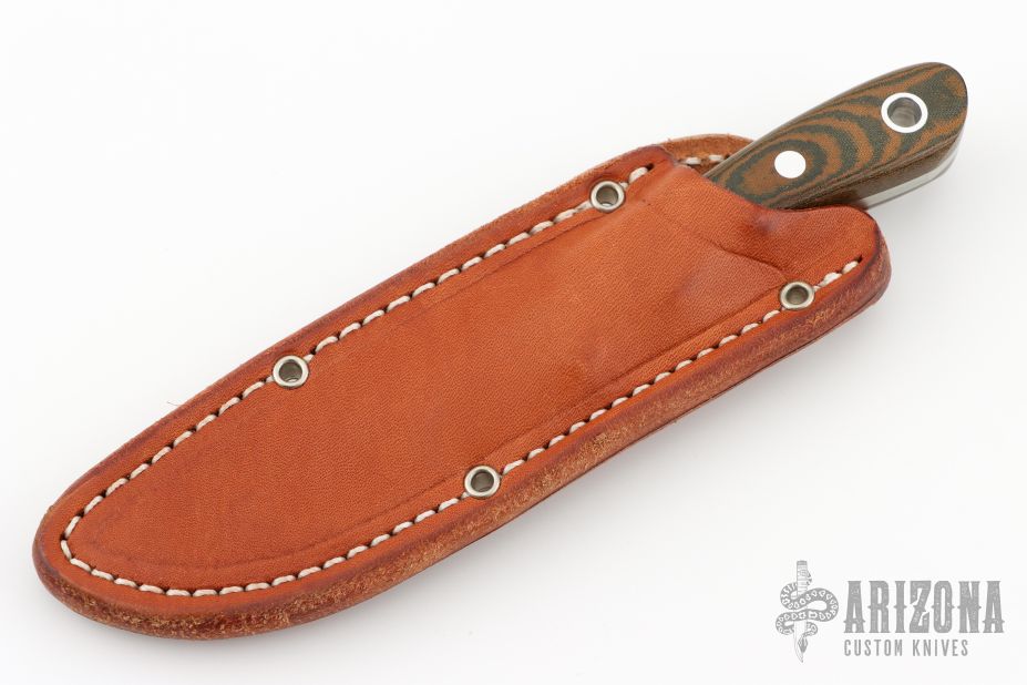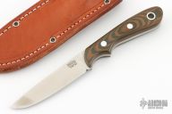 This knife by Bark River Knives features a satin finished blade with .156" blade stock and .831" blade depth, full tang construction. The handle has black/orange micarta covers with pins and lanyard hole. Comes with a leather sheath. Has some scuffs and patina, great condition otheriwise.