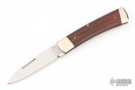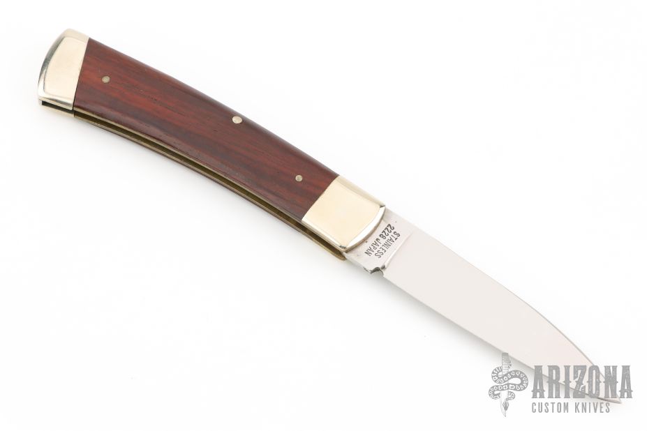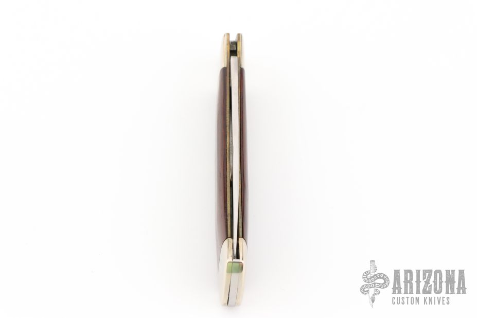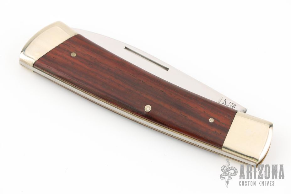 This KA-LOK by Ka-Bar features a polished blade with nail nick. The handle has nickel silver bolsters, cocobolo scales, brass liners, stainless steel backspacer. Comes with original box and papers. Excellent condition. This knife was made post-patent, and is marked US PAT 4268960