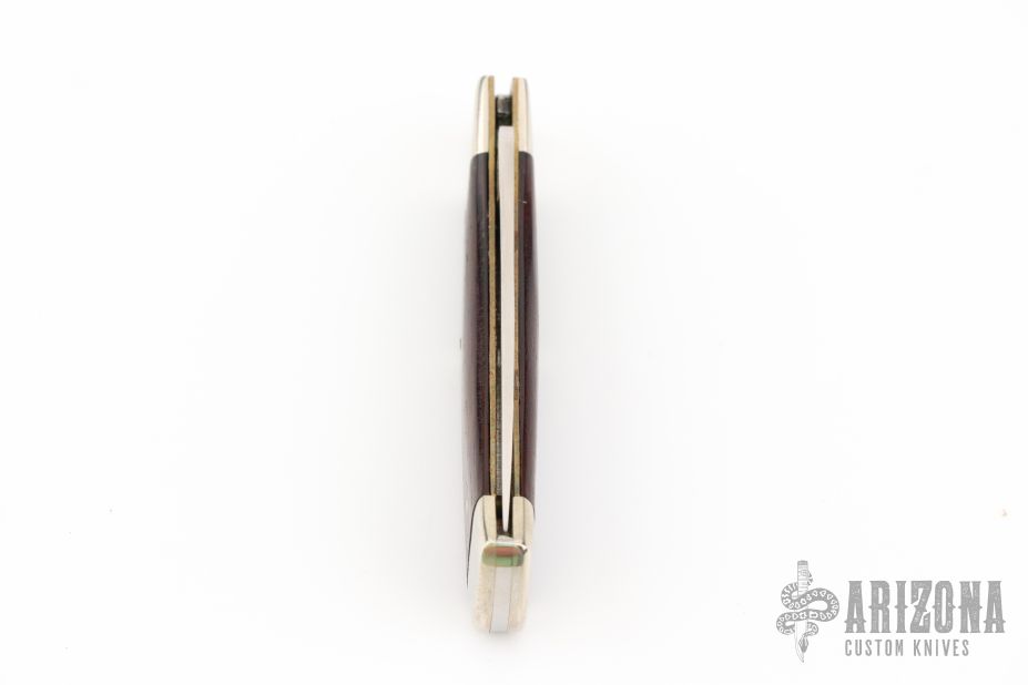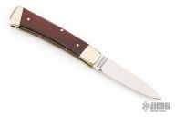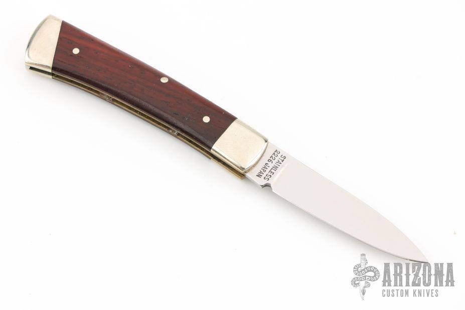 This KA-LOK by Ka-Bar features a polished blade with nail nick. The handle has nickel silver bolsters, cocobolo scales, brass liners, stainless steel backspacer. Comes with original box and papers. Excellent condition. This knife was made post-patent, and is marked US PAT 4268960
