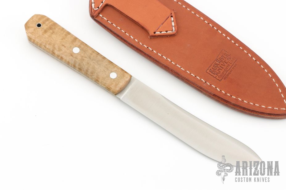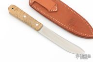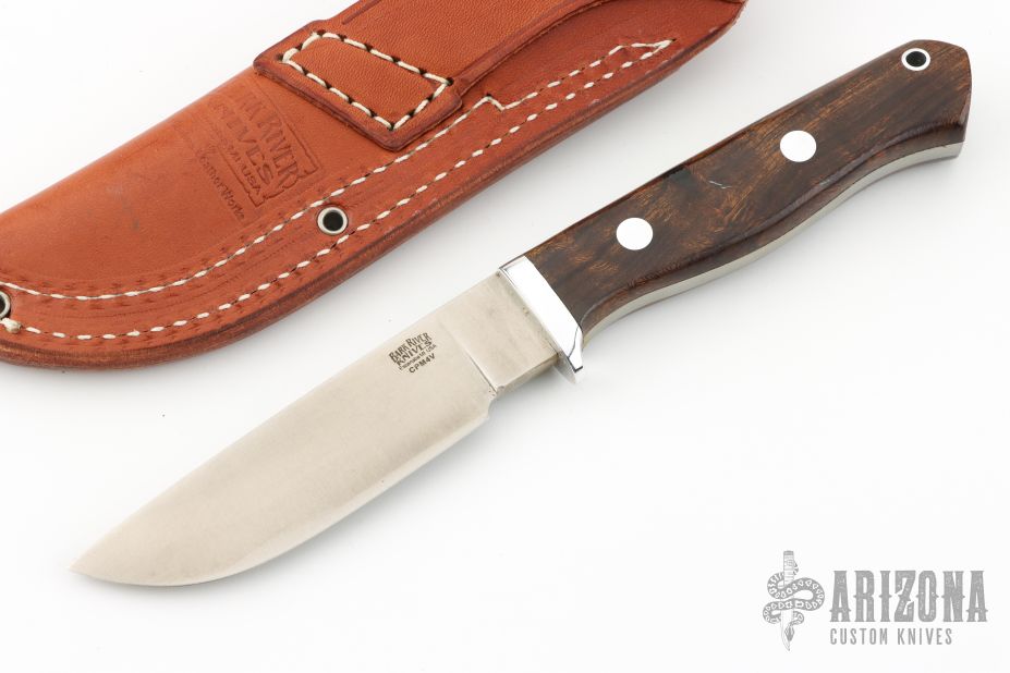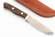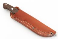 This Gameskeeper by Bark River Knives features a satin finished blade with .217" blade and 1.094" blade depth, full tang construction. The handle has a polished aluminum guard and wood scales with aluminum pins. Comes with a brown leather sheath. Has some patina, excellent condition otherwise.