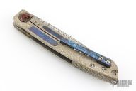 This Hayabusa 2 front flipper by Glenn E Waters features a Damasteel tanto recurve blade with notched front flipper, carbidized edge. The handle has a textured titanium frame, laser engraved titanium backspacer , Timascus inlay with 24k gold and silver Tiger and Dragon overlays, and tip up zircuti clip. Has a stainless lockface insert, lanyard hole and rides on bearings. Nice detent, action, lockup and blade seating. Comes with zippered case, COA dated 2019, custom pivot tool and original box. Excellent condition.