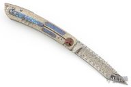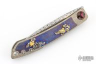 " I was born in Australia and trained as a Jeweler.I have been doing JuJutsu since I was 6 years old and developed my own style in 1990. I have a 7th Dan Black belt. I also study Batto, live sword cutting and have a 3rd Dan. I moved to Japan to live in 1986 and have been creating knives since 1993.In that time I have won many awards including best in show and best art knife at shows in America, Australia and Japan. My work has been published in many magazines in America, Australia, France, Italy, Japan and Russia. I do all the work myself, but I don't make my own steel. I prefer to use Damasteel, ZDP-189, VG-10 and ZDP-189 VG-10 san mai. Anything that looks like gold on my knives is either 18k or 24k gold. I like to use rare materials such as mammoth tusk, titanium, gold, silver and many others. Each knife that I create is a one of a kind and a work of love which I hope will survive the passing of time for many, many generations. That is why I use materials that are impossible to or very resilient to rust. My knifes often tell a story and have a Japanese theme to them. Probably a combination of my love of Japan, its history, mythology and the 35 years that I have been here in Japan. I also like to hide many interesting things on my knives as part of the voyage of discovery of my art."