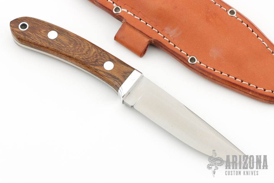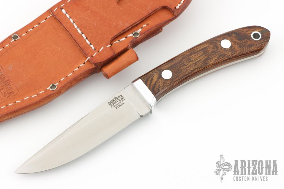This knife from Bark River Knives features a satin finish drop point blade with swedge, .144" blade stock and 1.064" blade depth, full tang construction. The handle has wood scales with aluminum pins and lanyard hole. Comes with a brown leather sheath. Has a couple light scuffs, excellent condition otherwise.