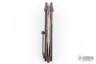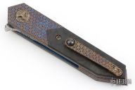 This Kaiken 2 by Glenn Waters, features a Damasteel blade with fullers and a flipper. The handle is composed of laser engraved, textured and anodized titanium bolsters with marble carbon fiber scales over anodized and textured titanium liners. textured and anodized titanium backspacer and tip up pocket clip with ceramic ball. Includes original box, zippered, pivot tool and papers dated 2019. Excellent condition.