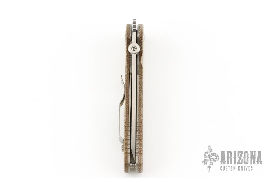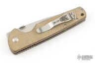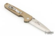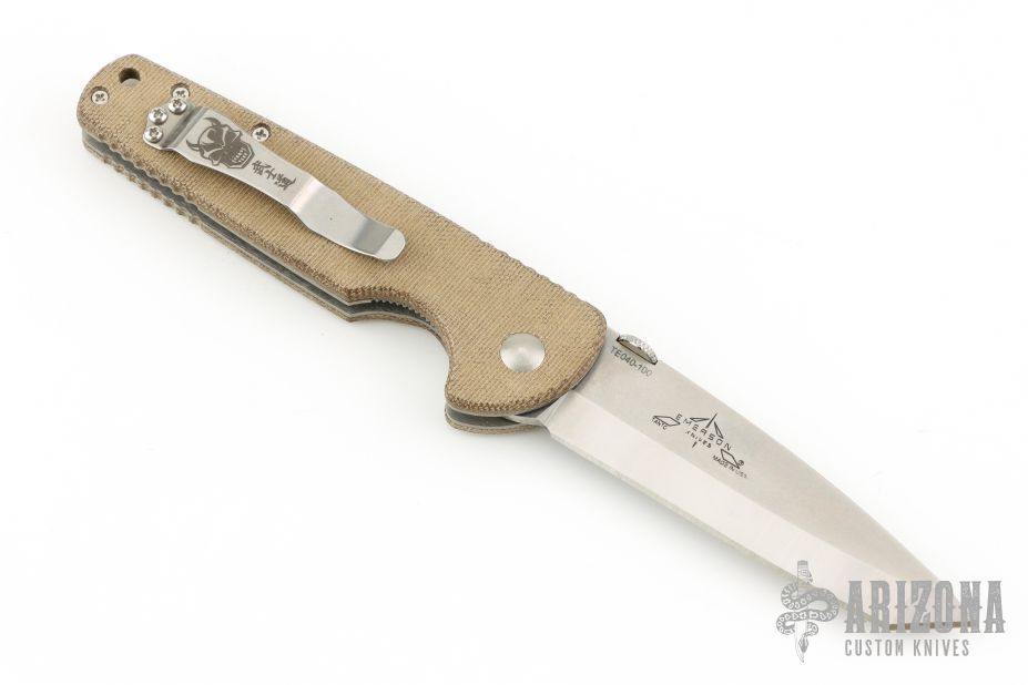 This Tanto BT by Emerson has a stone washed  tanto chisel ground blade with a right hand grind. Green Canvas Micarta scales, titanium liners, barrel spacers, milled thumb disk and a tip up black stainless clip. TE040-100.  Includes the original box and papers.  Excellent condition.