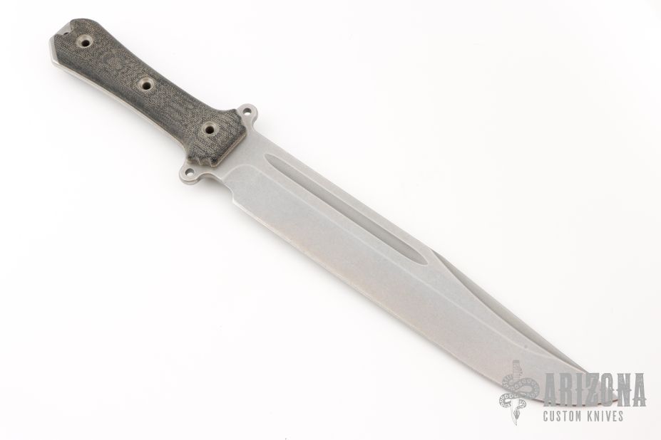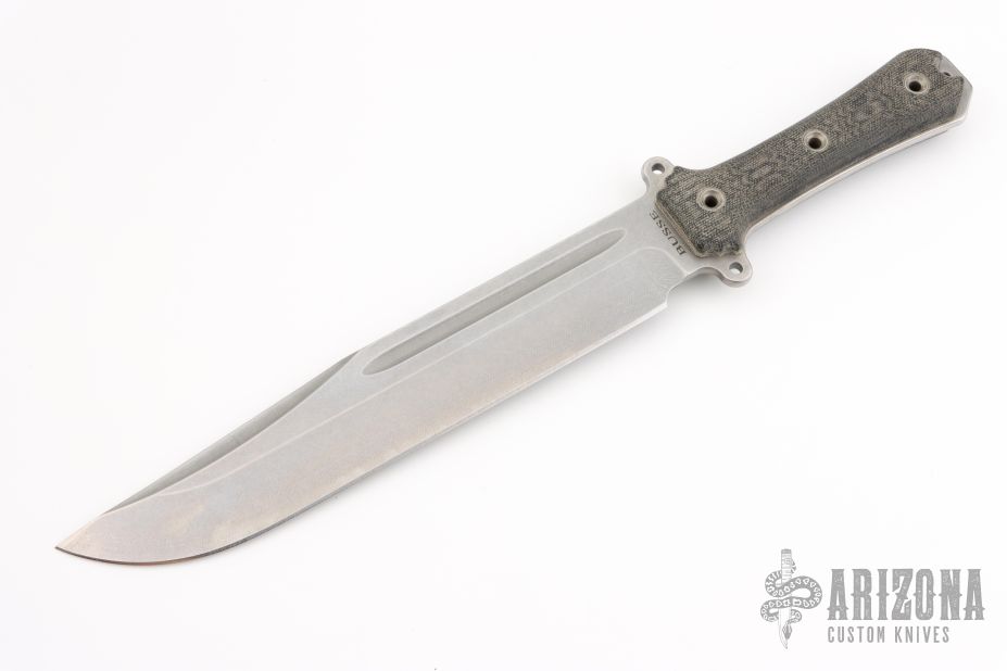 This ForeFather Bowie by Busse features a stonewash finished blade with false top edge and fullers, .211" blade stock and 1.785" blade depth, full tang construction with black canvas micarta scales. New from maker.