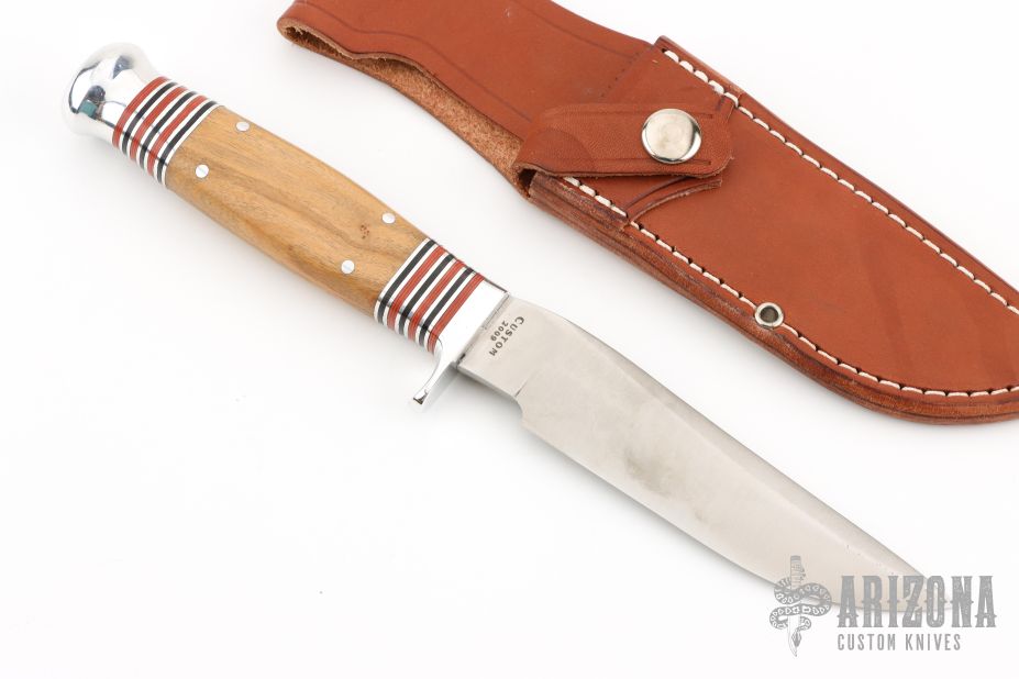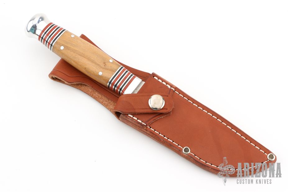 This Michigan Hunter by Bark River features a satin finished blade with false top edge, .161" blade stock and 1.154" blade depth, hidden tang construction. The handle has a polished aluminum guard and butt, wood grip with red/aluminum/black spacers. Comes with a leather sheath. Has some light marks, excellent condition otherwise.