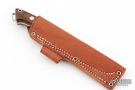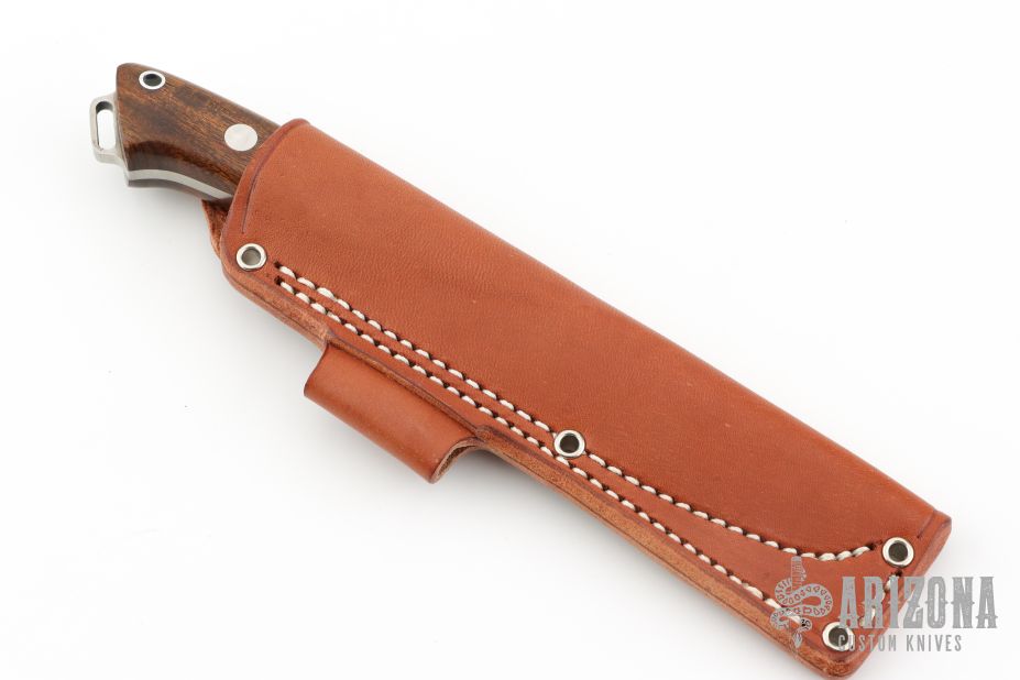 This Fox River fixed blade from Bark River Knives features a satin finish drop point blade with full flat grind. 0.156" blade stock and .966" blade depth. The handle is comprised of wood scales over full tang construction with lanyard bail on pommel. Includes a brown leather sheath. Has some patina. Execellent condition.
