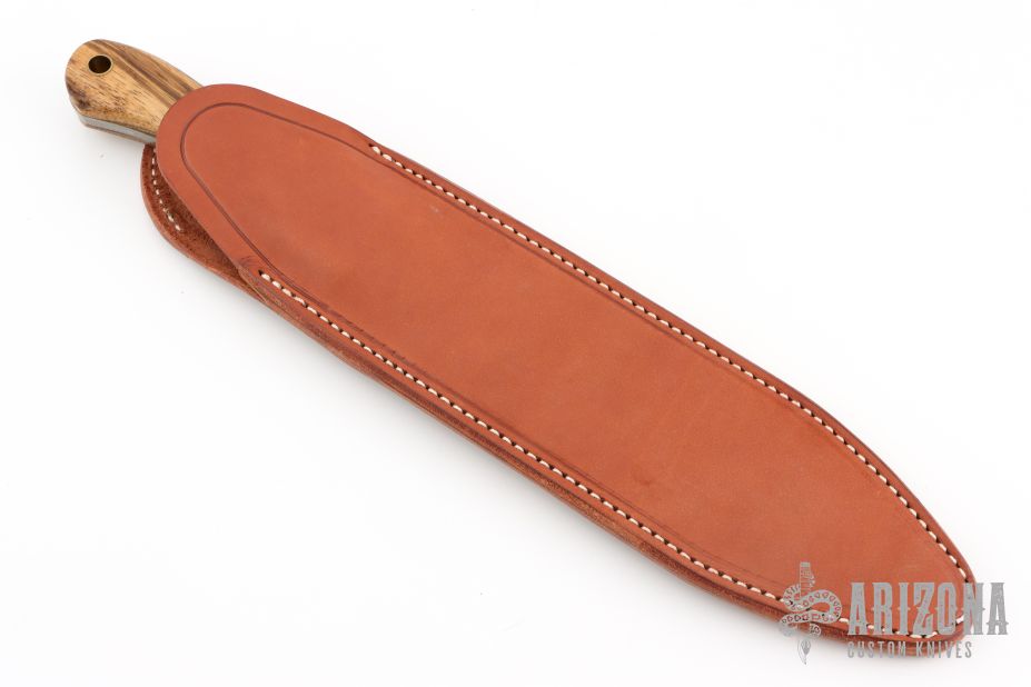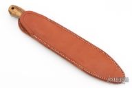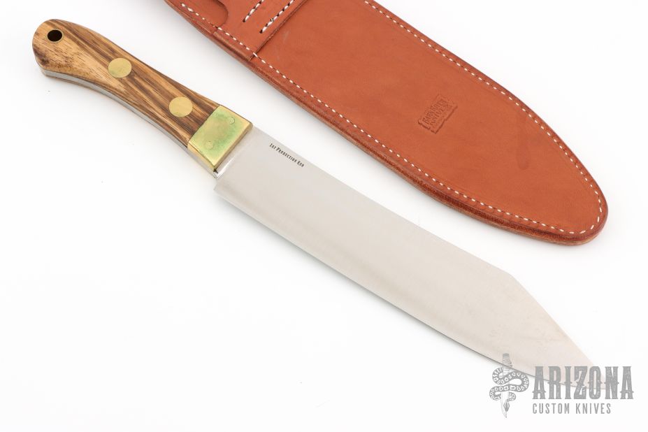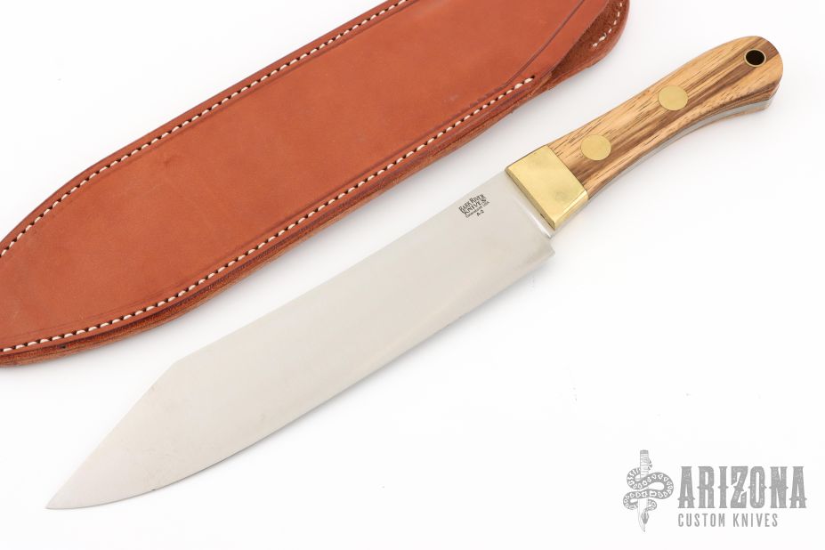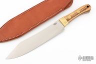 This knife by Bark River features a satin finished clip point blade with .191" blade stock and 1.732" blade depth, full tang construction. The handle has wood scales with brass pins, bolsters, and lanyard tube. Comes with a leather sheath (The tip of the knife has pushed through the tip of the sheath). Has some scuffs and patina. Great condition otherwise.