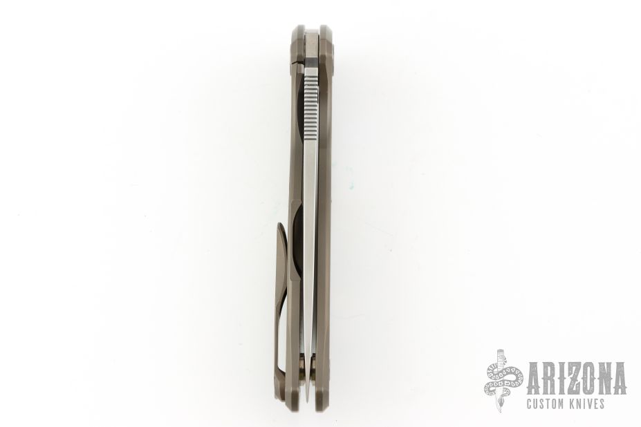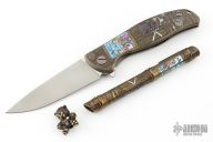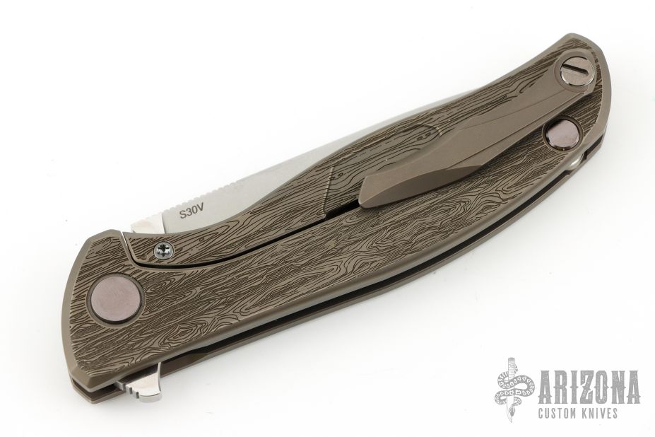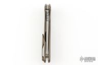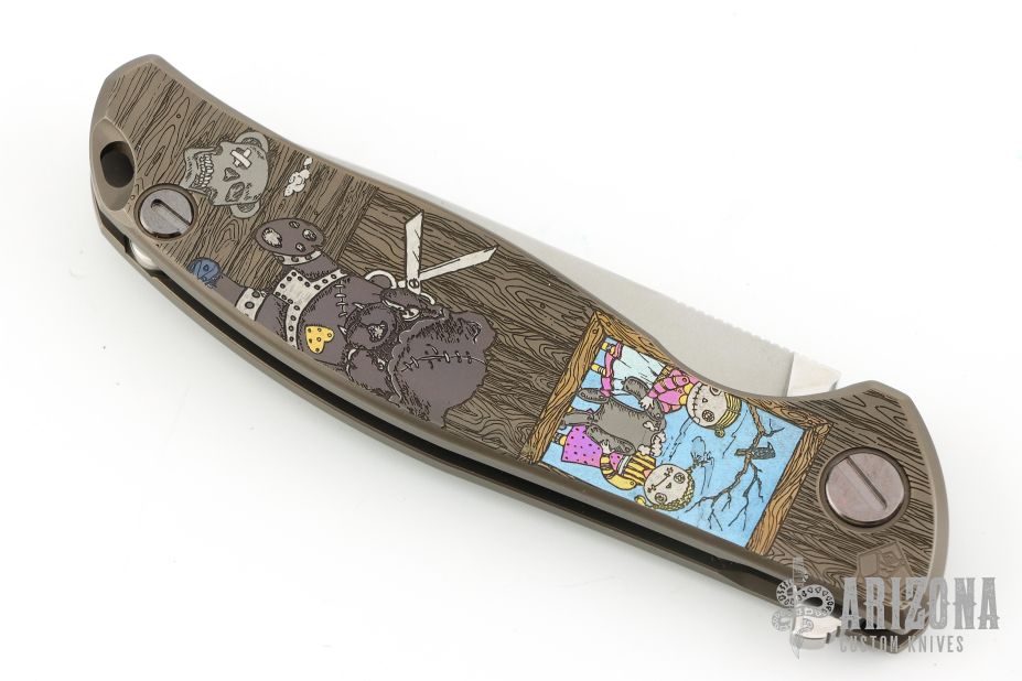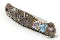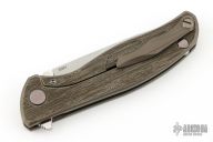 This F95 by Shirogorov Knives features a stone-washed blade with notched thumbrest and flipper. The handle has an engraved and anodized titanium frame done by Russian Engraver Dmitry Strettsov.  Nice detent, lock up and blade seating.  Excellent condition.