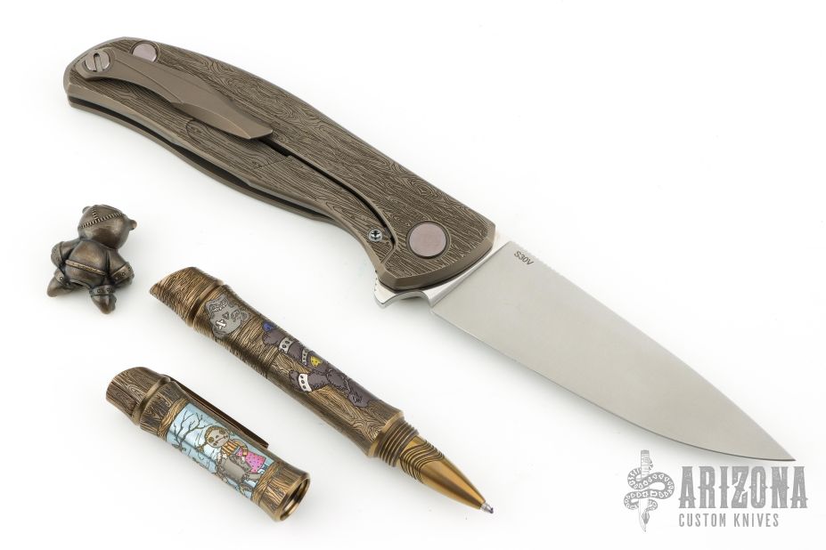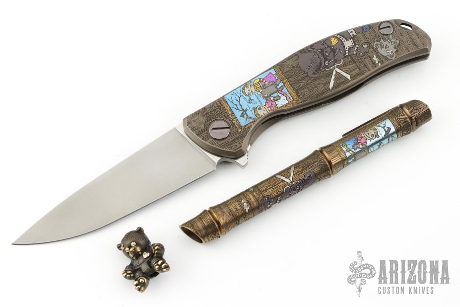 The Pen from Dmitry Streltsov features an anodized "Bad Teddy Clown" titanium body and pocket clip. Tip unscrews and turns around to screw in and reveal the pen tip.  Excellent Condition.