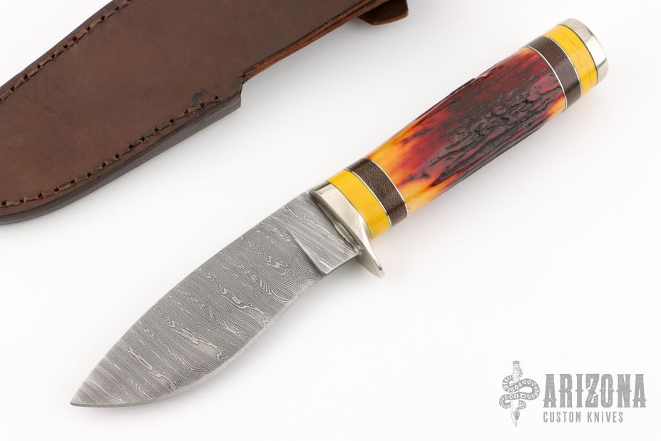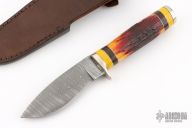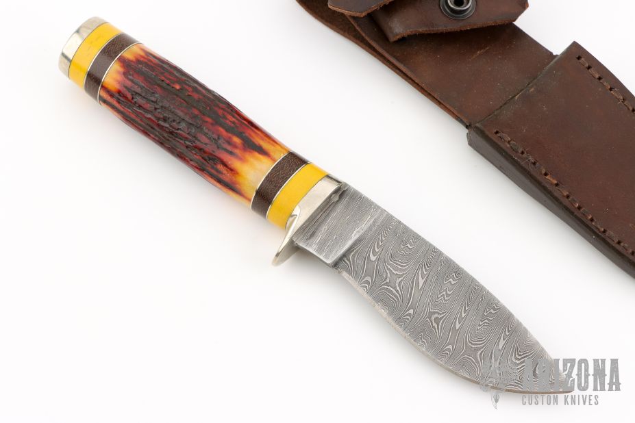 This fixed blade by Jim Ort features a Twist Damascus blade with .157" blade stock and 1.316" blade depth, hidden tang construction. The handle has nickel silver guard and butt, stag grip, yellow linen micarta, black canvas micarta and nickel silver spacers. Comes with a leather belt sheath. New from maker.