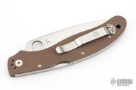 This C54GPBN Calypso Pln by Spyderco Knives features a satin finished blade with thumbhole. The handle has brown G-10 scales and stainless steel liners and pocket clip, 4-way reversible. Sprint Run, 1000 made. Comes in a Spyderco box with the label on the box has been torn off. Has a couple light scuffs, excellent condition otherwise.