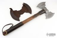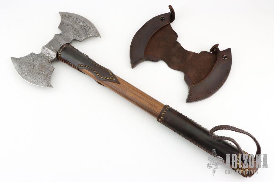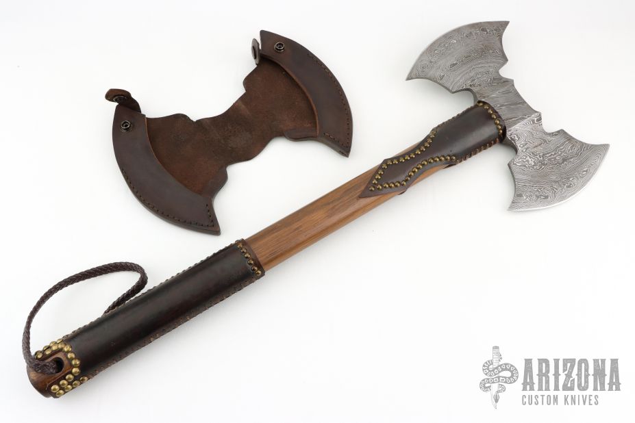 This Viking War Ax by Jim Ort features a Damascus double bit axe with 5.625" blade lengths and 9.125" from blade edge to blade edge. The handle is wood with leather wrap and brass studs, braided leather lanyard at the butt. Comes with a brown leather sheath. New from maker.