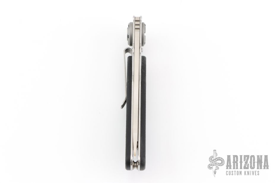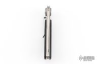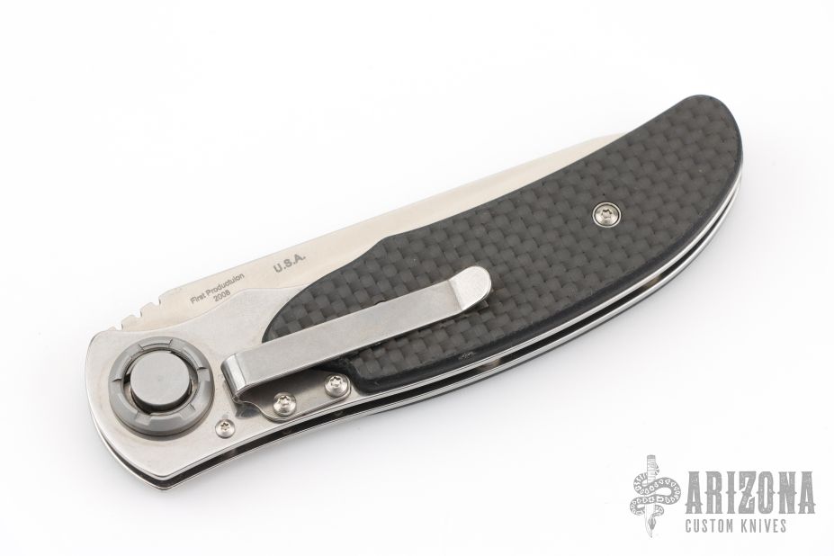 This Paul Protector has a satin finished 154 CM stainless steel clip point blade with notched thumb rest. Handle is carbon fiber over mirror polish stainless steel frame. Stainless steel tip down clip. Has some light scuffs and scratches, otherwise excellent condition.