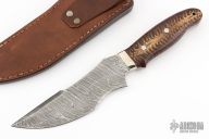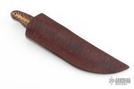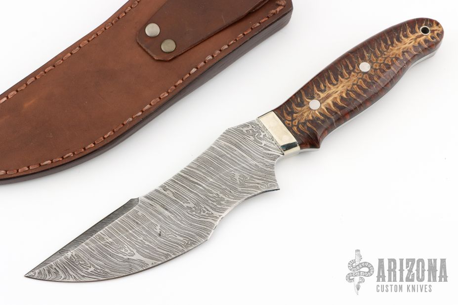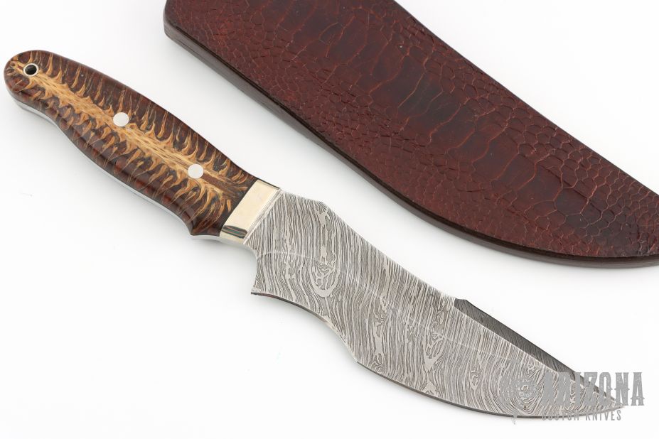 This knife by Jim Ort features a Damascus blade with sharpened top edge, .180" blade stock and 1.897" blade depth, full tang construction. The handle has nickel silver bolsters, stabilized pine cone scales with black liners. Comes with a very nice leather sheath with red Ostrich leg skin overlay. New from maker.