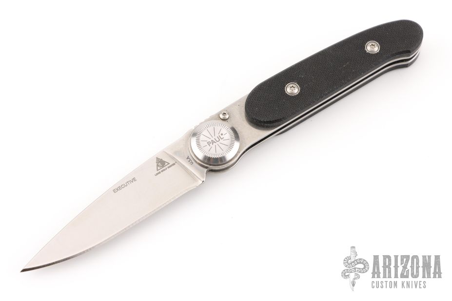 This Paul Executive knife features a tumble finished drop point blade. Stainless steel frame with G-10 overlays. Comes in a leather pocket sheath. Has some light scuffs and scratches, great condition otherwise.