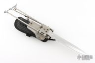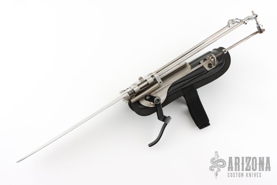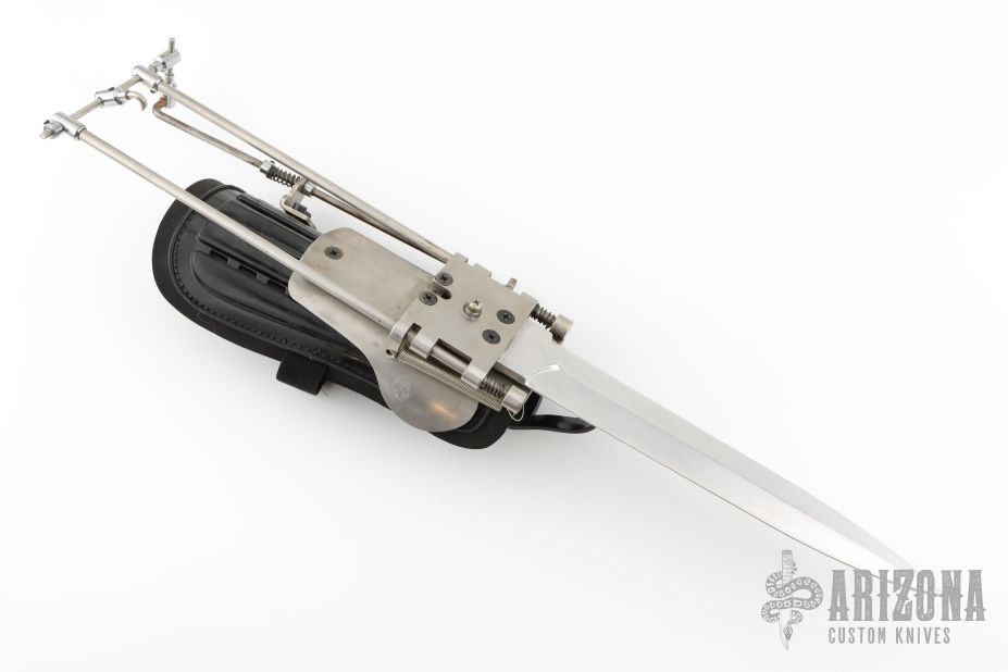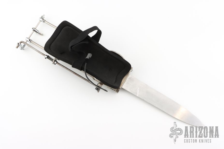 This screen-used hidden gauntlet and blade were wielded by Jigsaw (Tobin Bell) in James Wan's Saw (2004). The distinctive arced blade and rivet configuration are instantly recognizable from the scene in which Jigsaw reveals the weapon from beneath his cloak to slash Detective David Tapp’s (Danny Glover) throat.