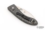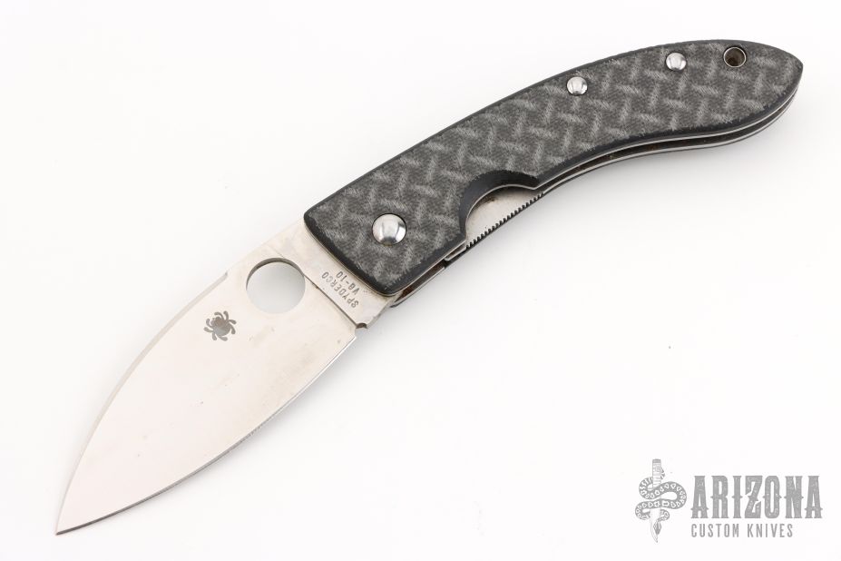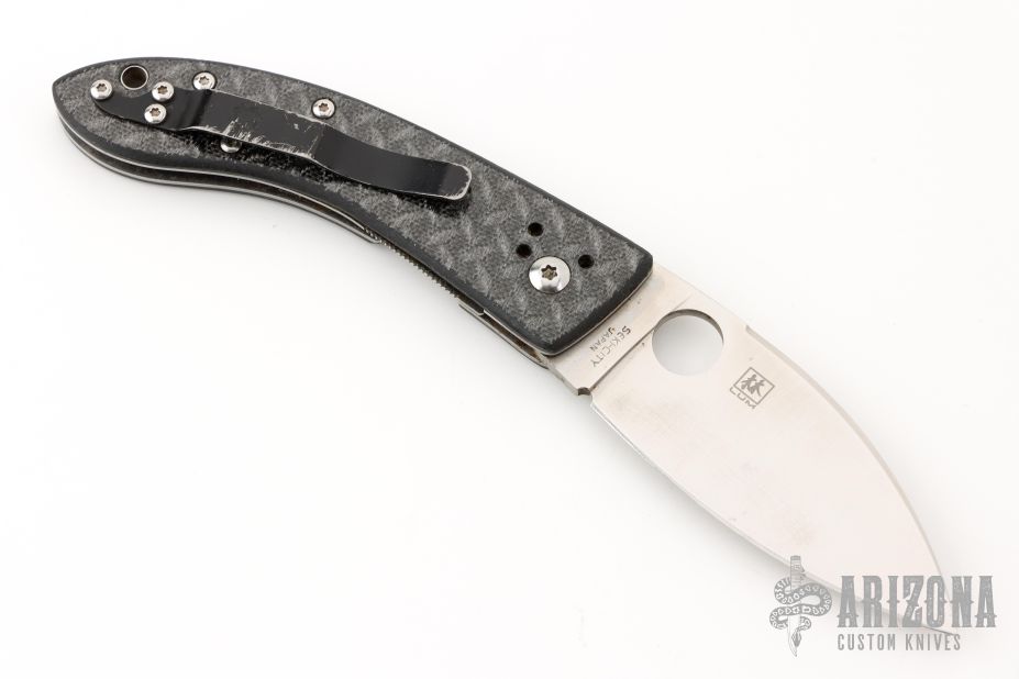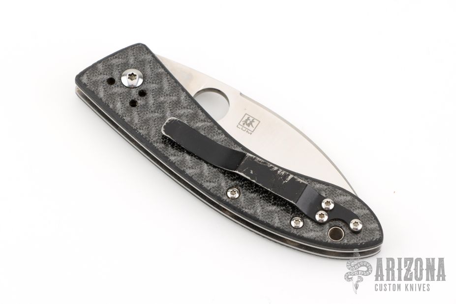 This Lum Chinese folder from Spyderco has a satin finished blade with thumbhole and false top edge. The handle has carbon fiber scales, stainless steel liners, and a black up or down reversible stainless steel clip. Has scuffs and scratches throughout. Good condition otherwise.