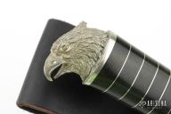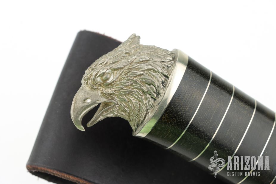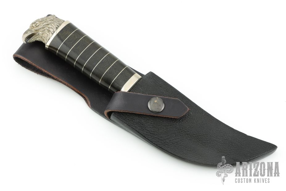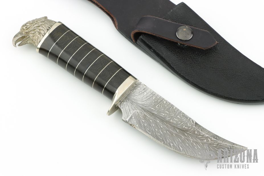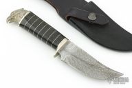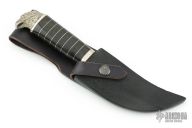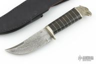 This Skinner by Jim Ort features a Feather Damascus blade with false top edge, .164" blade stock and 1.450" blade depth, hidden tang construction. The handle has a nickel silver guard and an Eagle's head carved nickel silver butt, stacked black linen micarta and nickel silver grip. Comes with a black leather sheath. New from maker.
