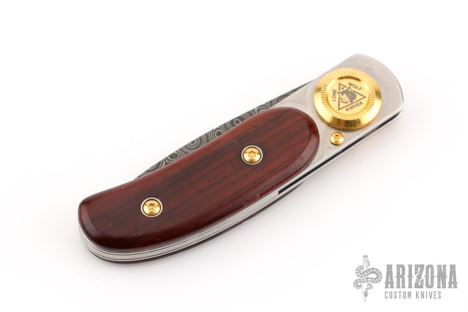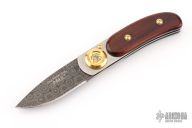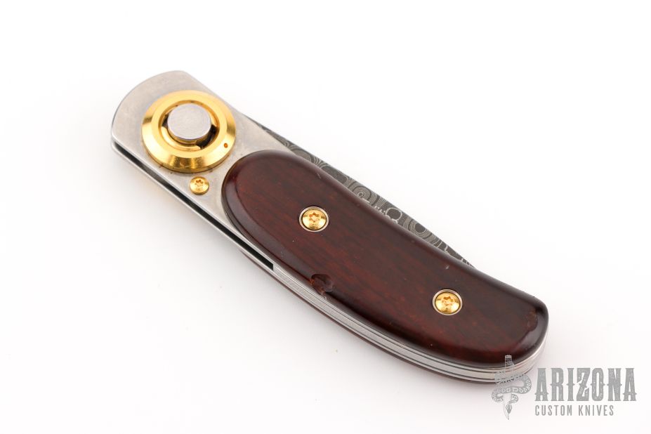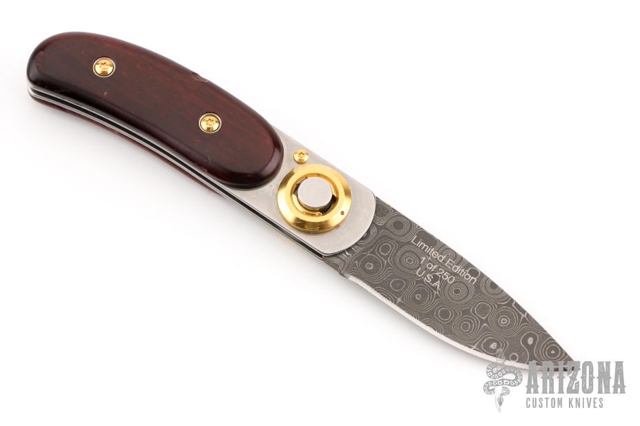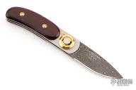 This Paul Pocket Knife features the Paul Poehlmann axial locking mechanism. Opens by depressing the button on the backside and rotating the face side dial. Closes the same way, rotating the dial in the opposite direction. Gold-plated accent fasteners. The handle has burl scales over stainless steel liners and backspacer, Damascus blade. Comes in original tin case. Has a couple light scuffs and scratches, excellent condition otherwise.