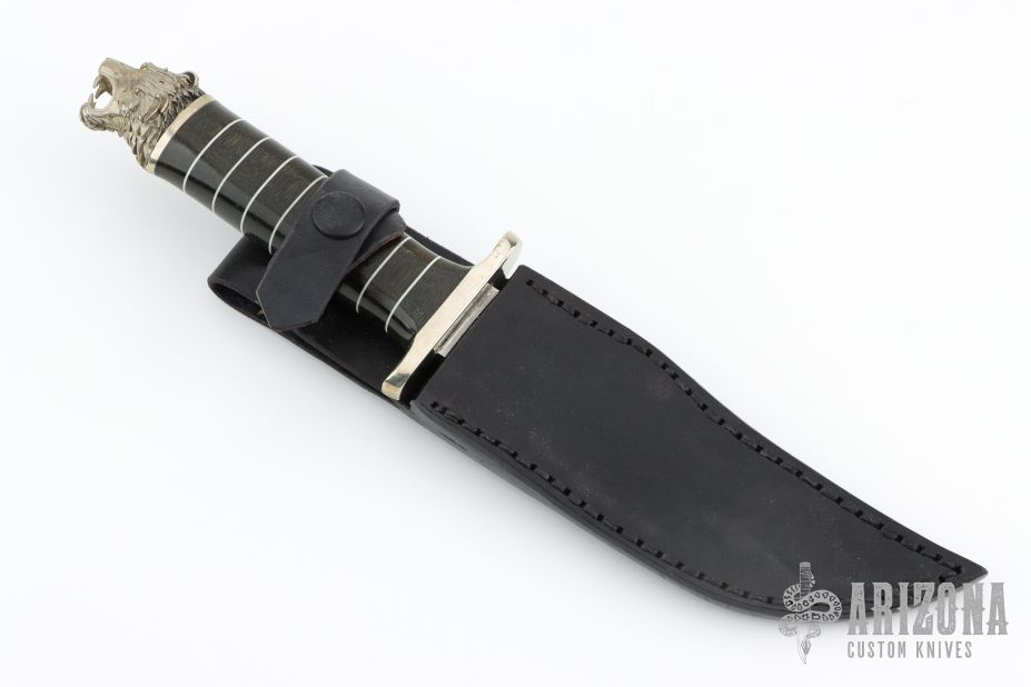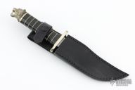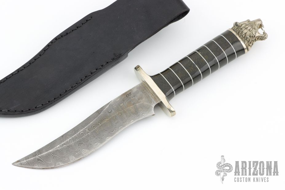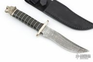 This Figther by Jim Ort features a Damascus blade with false top edge, .161" blade stock and 1.372" blade depth, hidden tang construction. The handle has a nickel silver guard and a Lion's head carved nickel silver butt, stacked black linen micarta and white G-10 grip. Comes with a black leather sheath. New from maker.