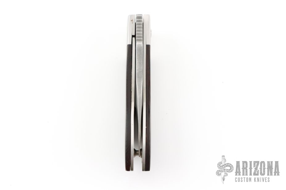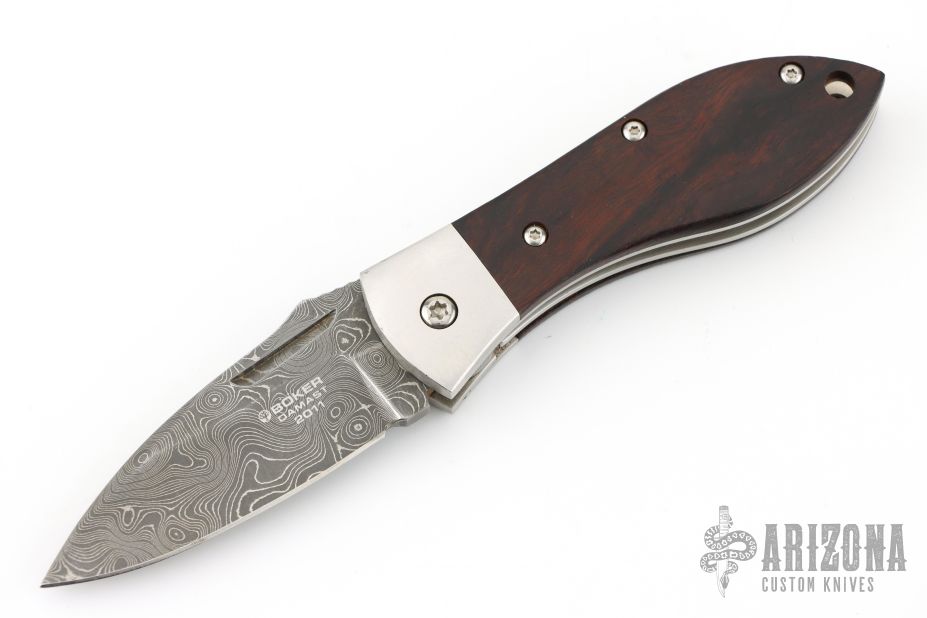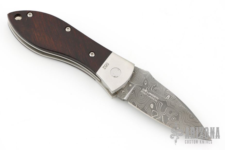 This liner-lock folder by Boker features a spear point Damascus blade with nail nick and a notched thumb-rest. The handle has titanium bolsters, wood scales, and titanium liners. Comes with a wooden box and original papers. #052 Has some scuffs and scratches, great condition otherwise.